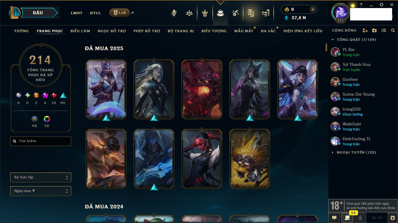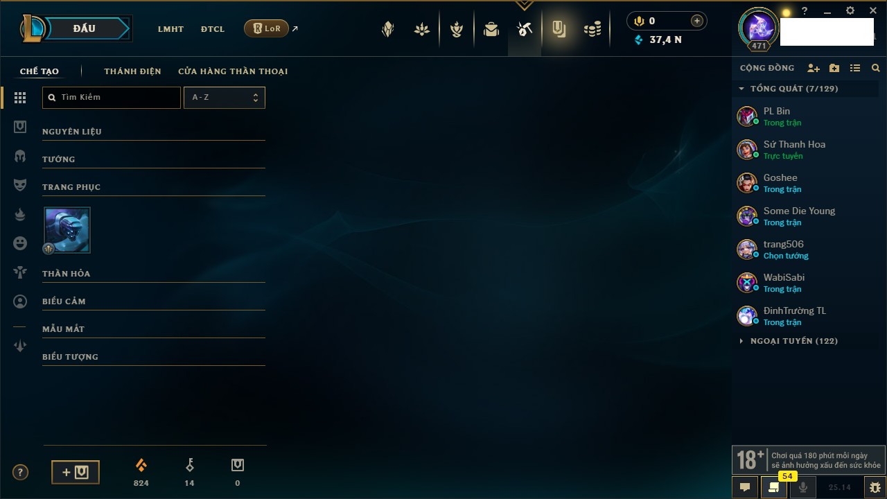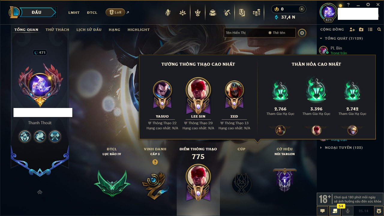 Rank Đơn: Chưa RankKhung: VàngTướng: 171 - Còn 207237 THXTrang Phục: 125Rank ĐTCL: Chưa RankLinh Thú: 112