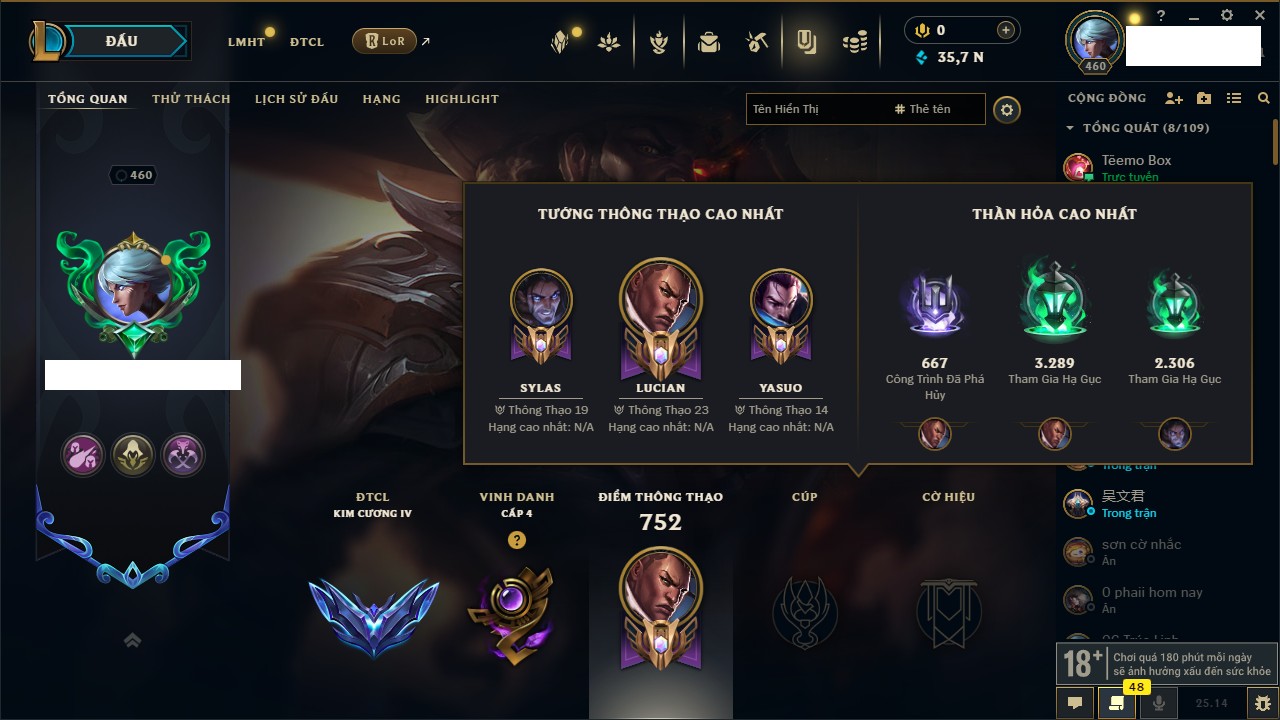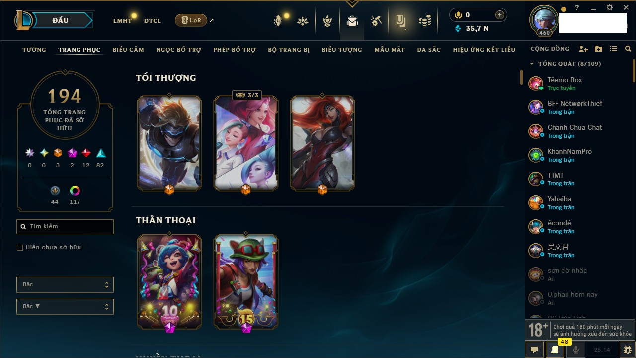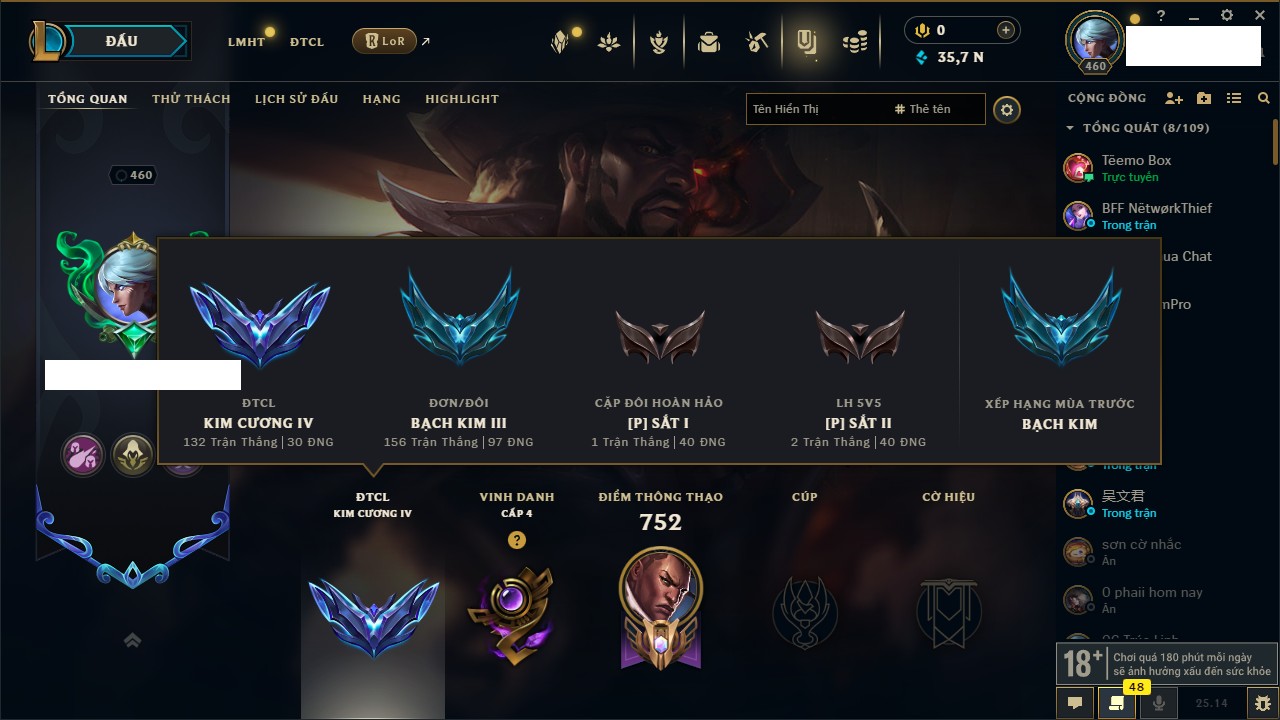 Rank Đơn: Bạch Kim IIKhung: Bạch kimTướng: 171 - Còn 316137 THXTrang Phục: 89Rank ĐTCL: Bạch Kim IIILinh Thú: 94