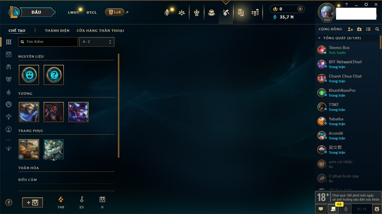 Rank Đơn: Lục Bảo IVKhung: VàngTướng: 171 - Còn 154648 THXTrang Phục: 203Rank ĐTCL: Bạch Kim IVLinh Thú: 69