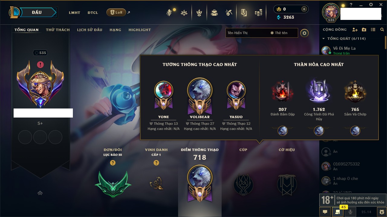 Rank Đơn: Chưa RankKhung: Chưa có khungTướng: 165 - Còn 1609 THXTrang Phục: 25Rank ĐTCL: Chưa RankLinh Thú: 44