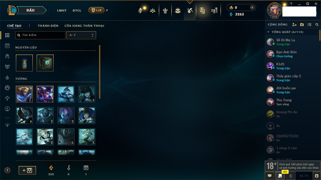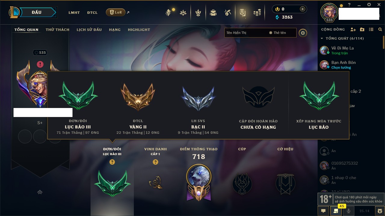 Rank Đơn: Chưa RankKhung: Chưa có khungTướng: 160 - Còn 21398 THXTrang Phục: 380Rank ĐTCL: Chưa RankLinh Thú: 27