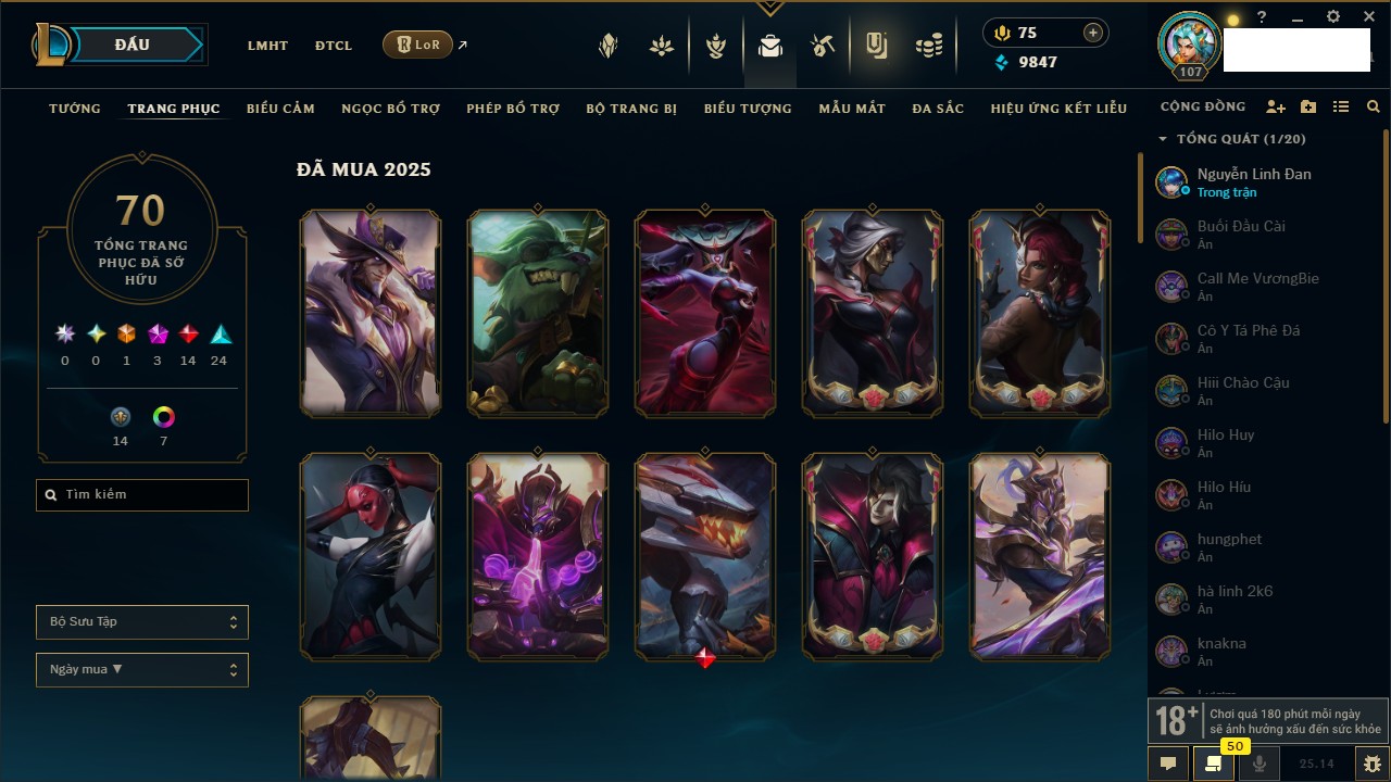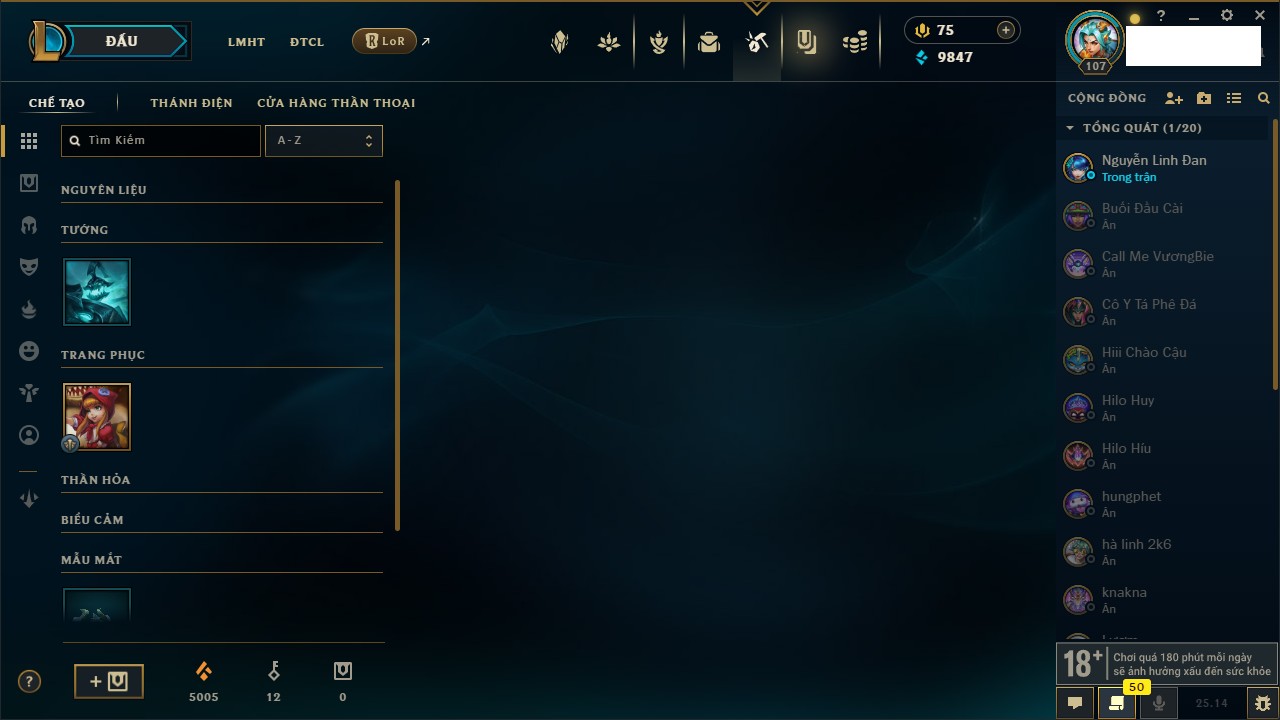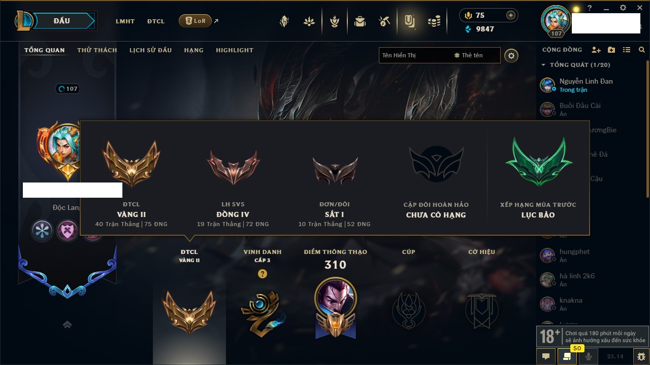 Rank Đơn: Vàng IIIKhung: BạcTướng: 171 - Còn 101359 THXTrang Phục: 88Rank ĐTCL: Kim Cương IVLinh Thú: 200