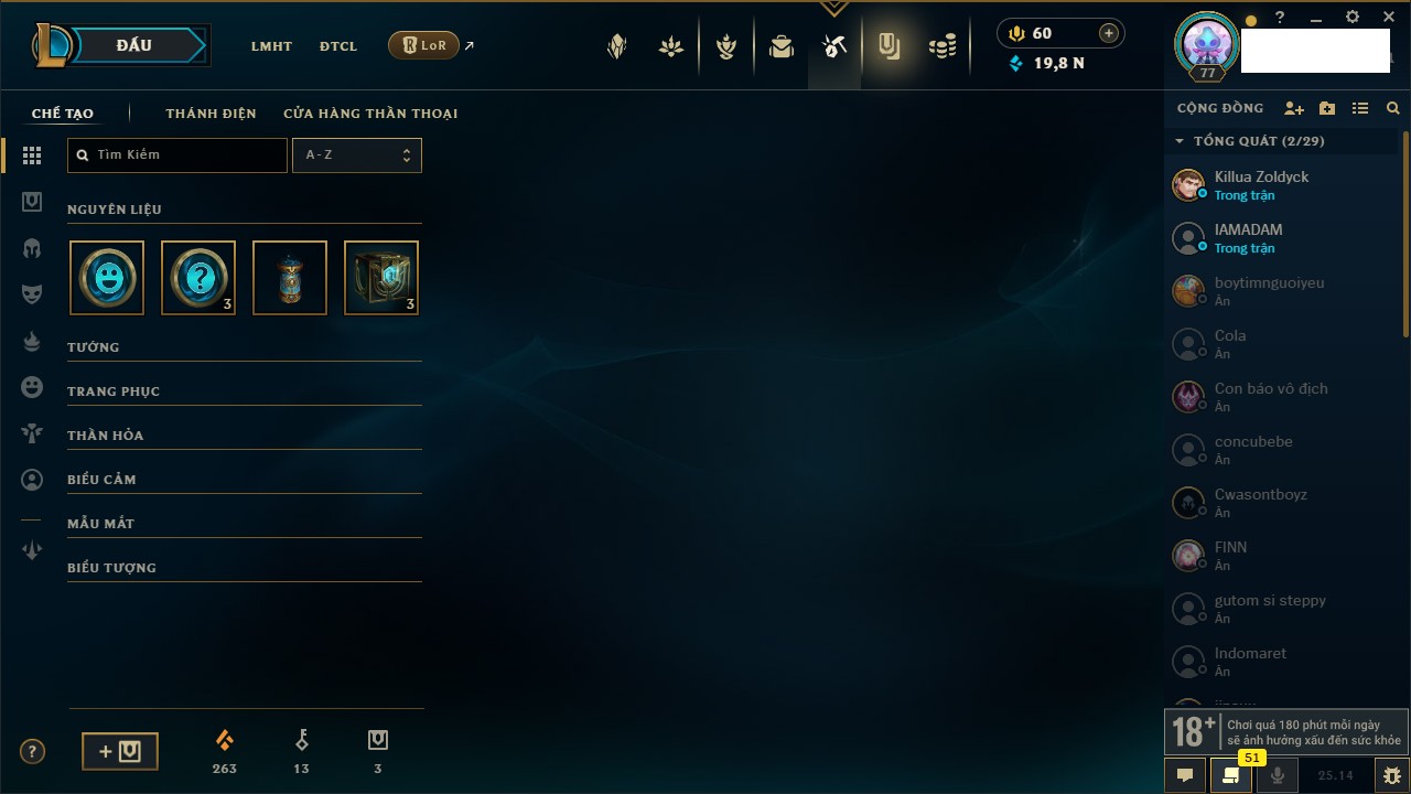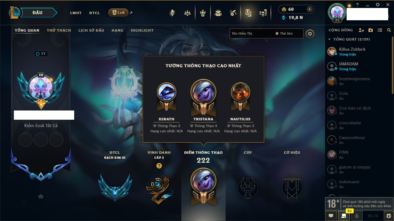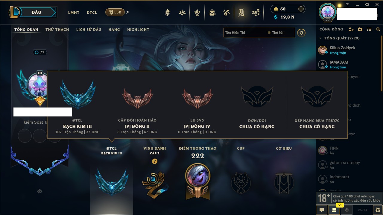 Rank Đơn: Vàng IIIKhung: BạcTướng: 171 - Còn 101359 THXTrang Phục: 88Rank ĐTCL: Kim Cương IVLinh Thú: 200