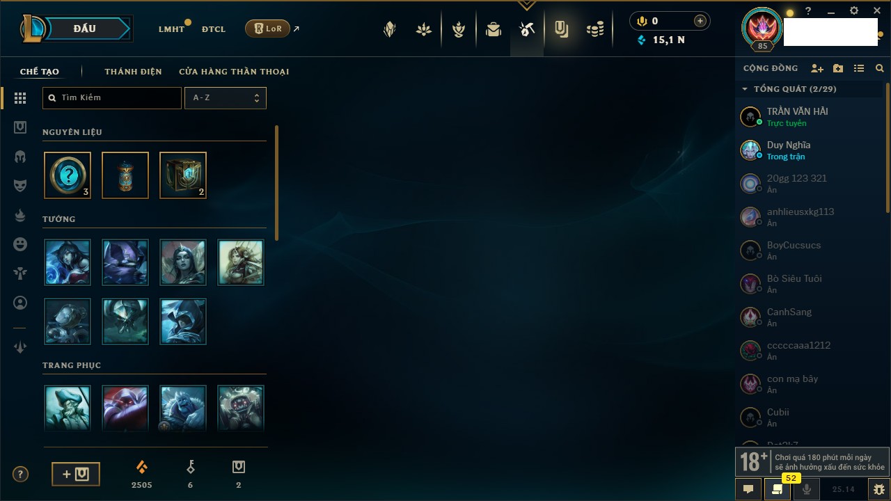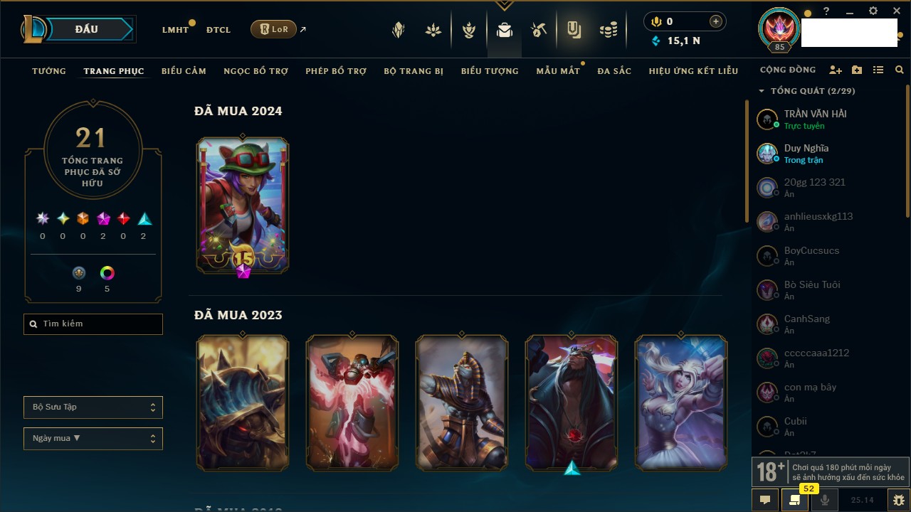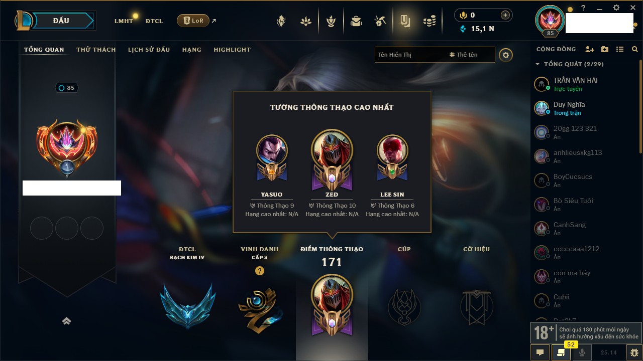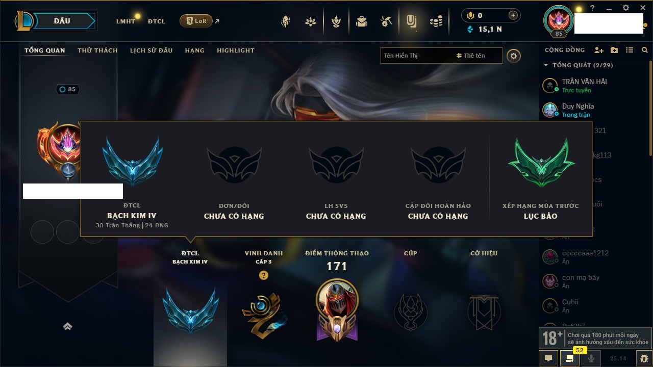 Rank Đơn: Vàng IIIKhung: BạcTướng: 171 - Còn 101359 THXTrang Phục: 88Rank ĐTCL: Kim Cương IVLinh Thú: 200