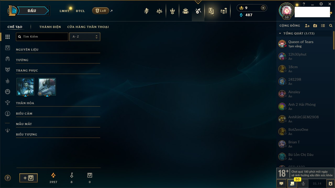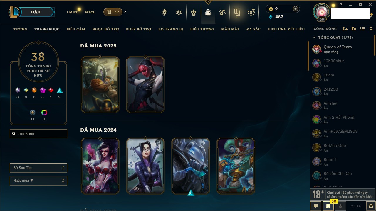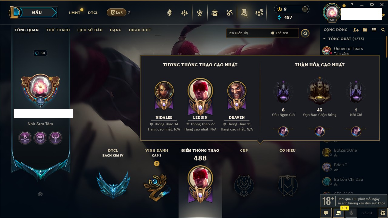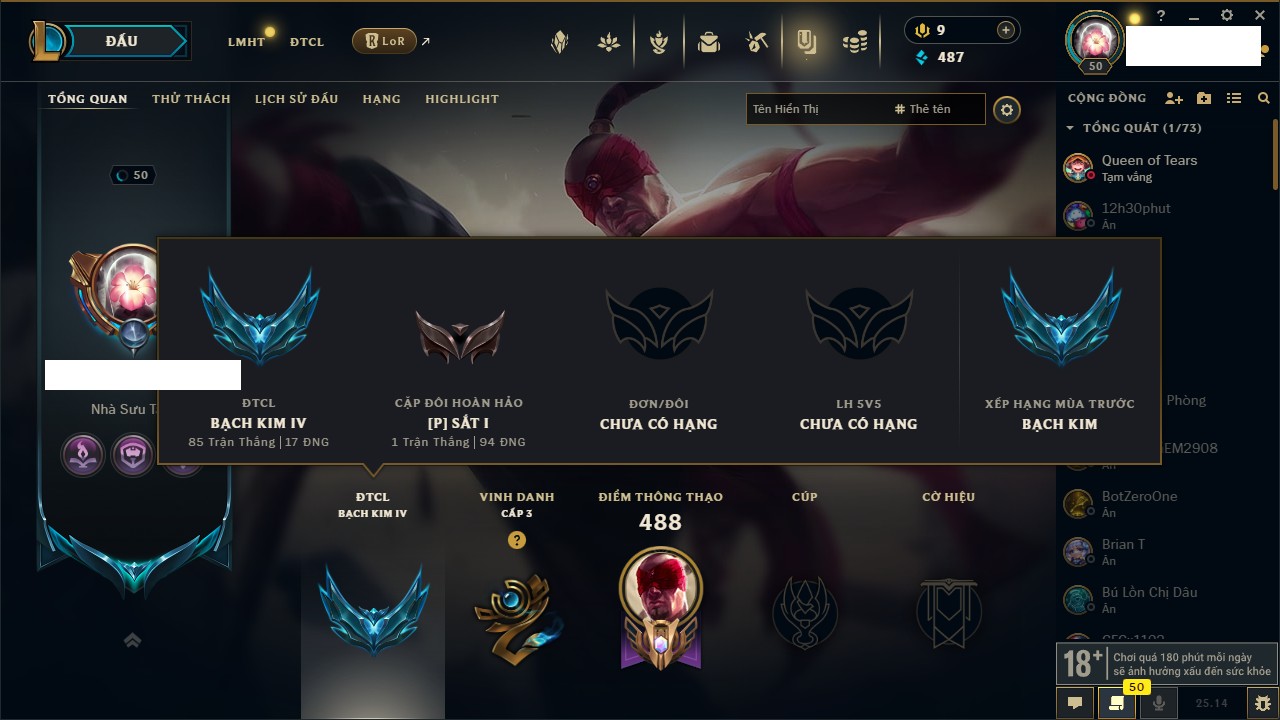 Rank Đơn: Đồng IIKhung: Chưa có khungTướng: 170 - Còn 56487 THXTrang Phục: 90Rank ĐTCL: Chưa RankLinh Thú: 129