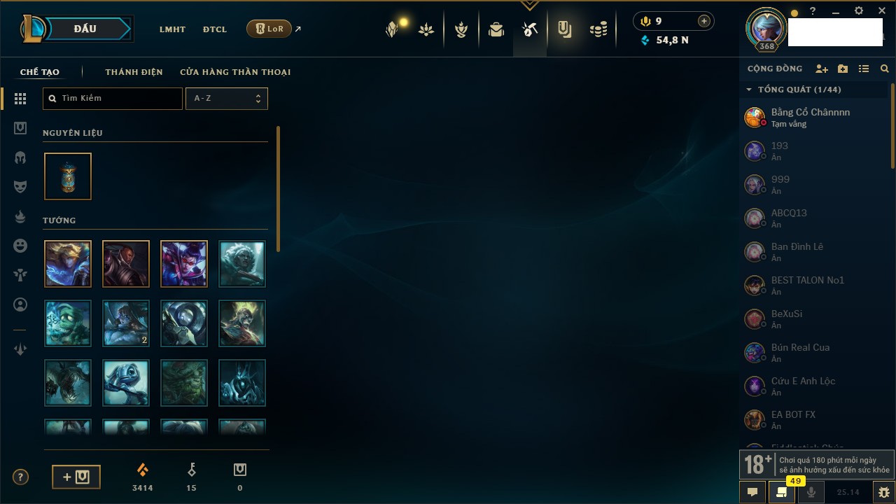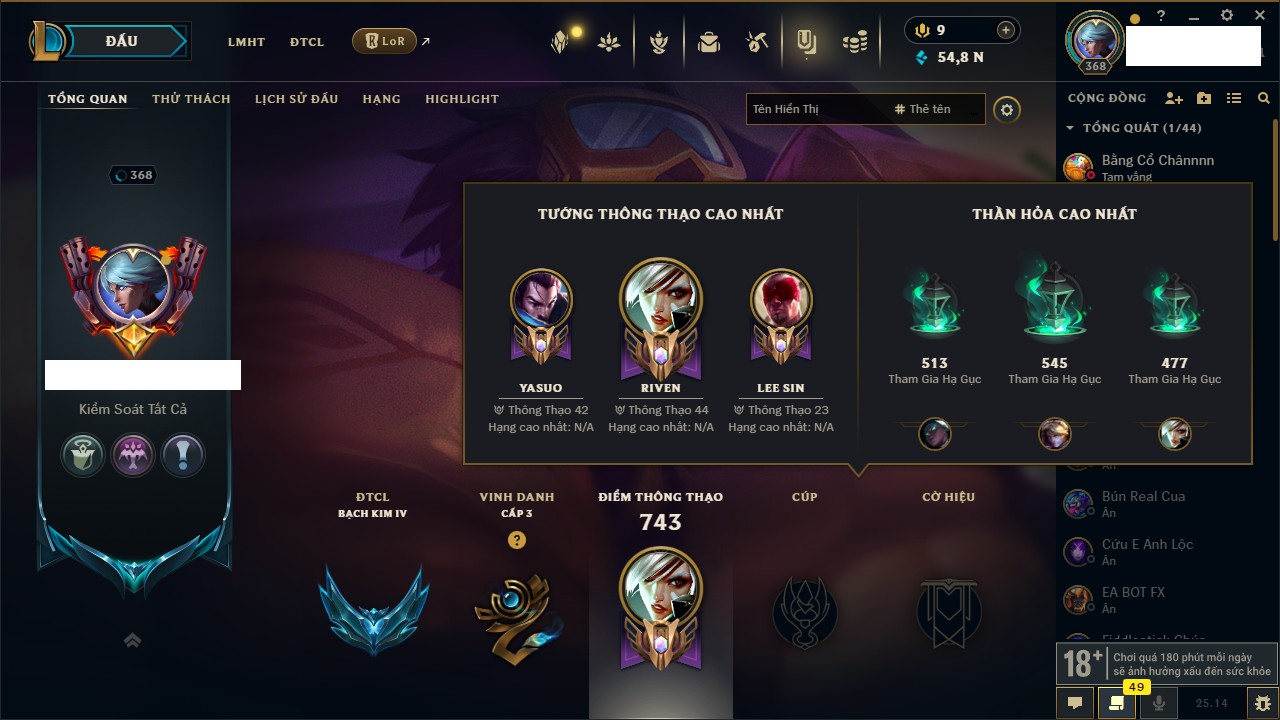 Rank Đơn: Bạc IIIKhung: Chưa có khungTướng: 171 - Còn 21493 THXTrang Phục: 252Rank ĐTCL: Bạch Kim IVLinh Thú: 123