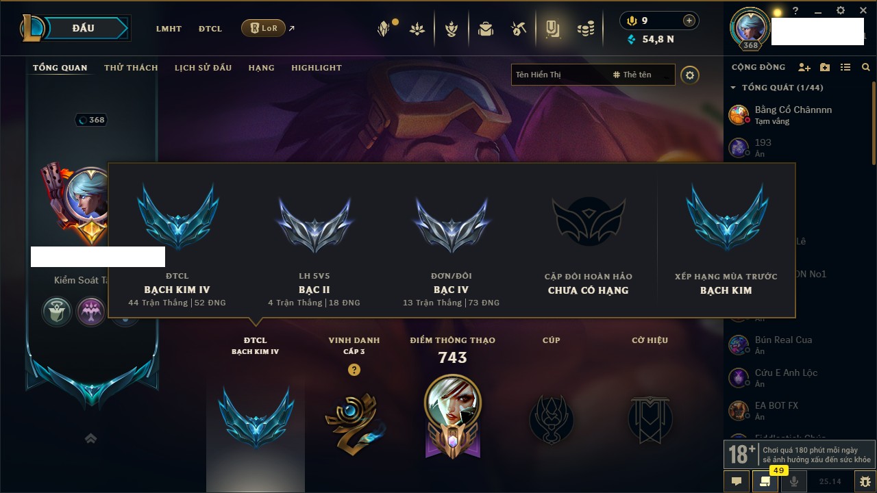 Rank Đơn: Bạch Kim IIIKhung: VàngTướng: 126 - Còn 23055 THXTrang Phục: 114Rank ĐTCL: Chưa RankLinh Thú: 21