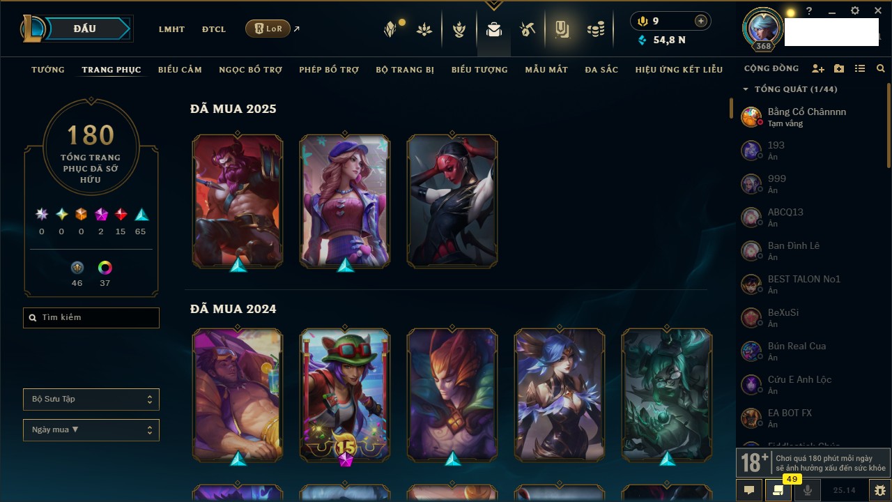 Rank Đơn: Vàng IIIKhung: VàngTướng: 161 - Còn 162202 THXTrang Phục: 179Rank ĐTCL: Chưa RankLinh Thú: 20