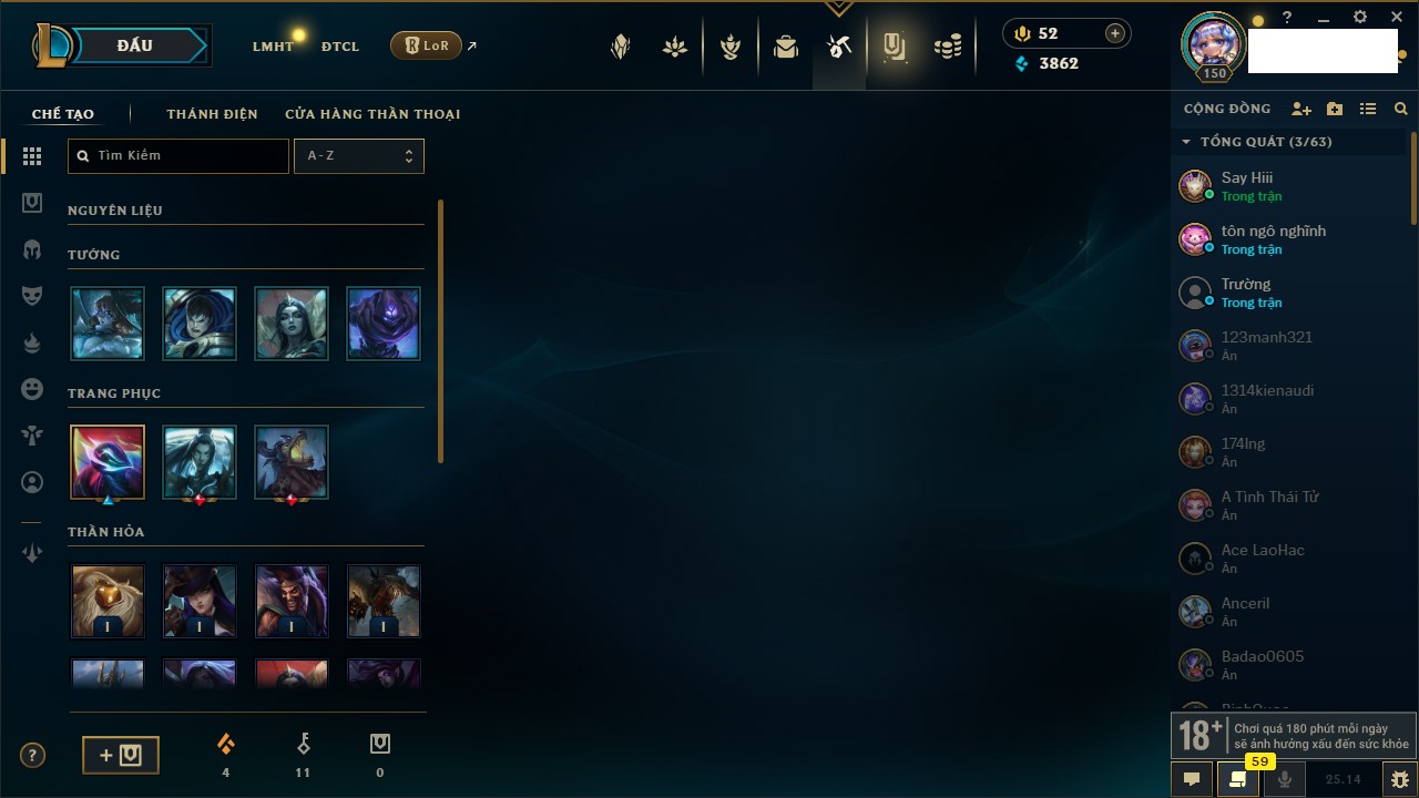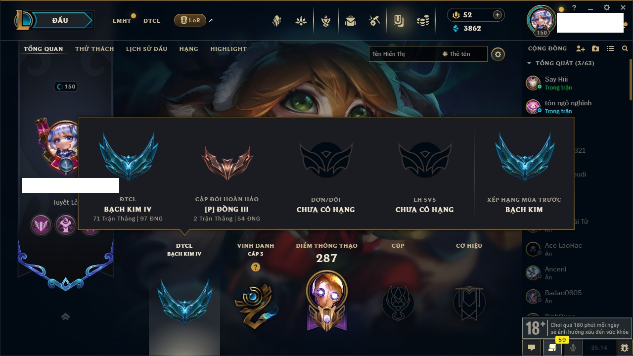 Rank Đơn: Chưa RankKhung: Chưa có khungTướng: 37 - Còn 27387 THXTrang Phục: 10Rank ĐTCL: Chưa RankLinh Thú: 1