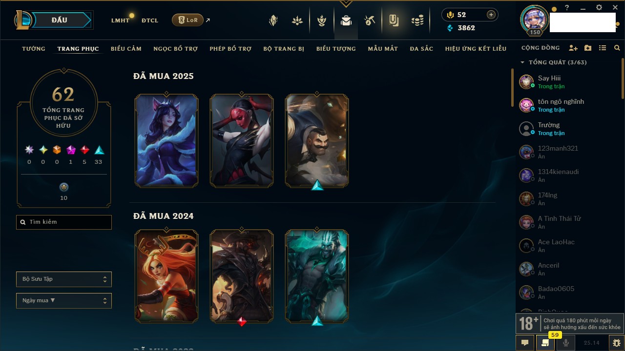 Rank Đơn: Chưa RankKhung: Chưa có khungTướng: 55 - Còn 6150 THXTrang Phục: 33Rank ĐTCL: Chưa RankLinh Thú: 9