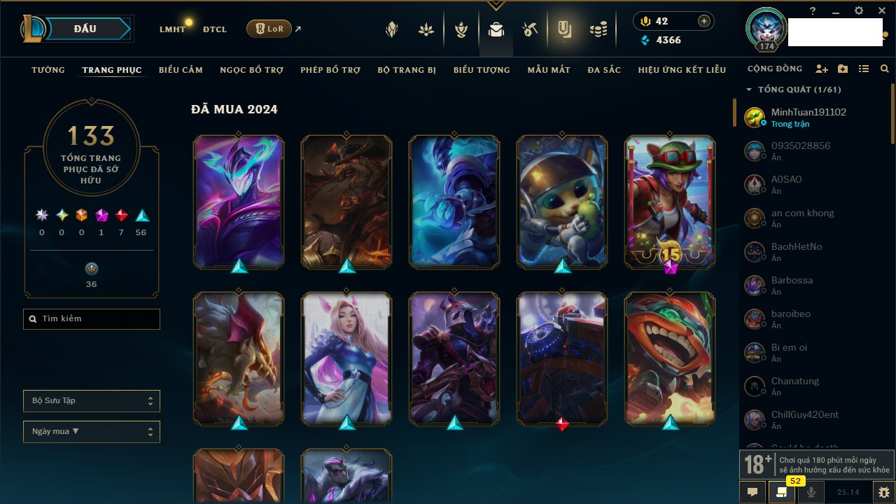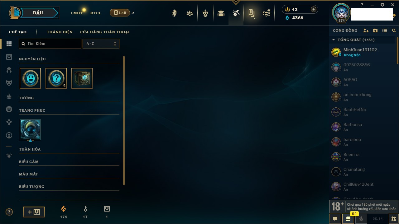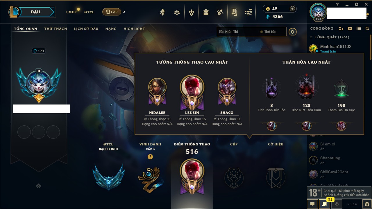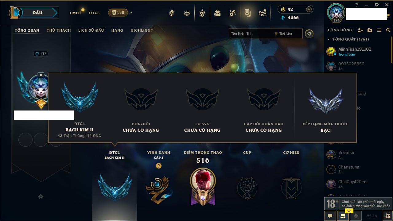 Rank Đơn: Đồng IIKhung: Chưa có khungTướng: 170 - Còn 56487 THXTrang Phục: 90Rank ĐTCL: Chưa RankLinh Thú: 129