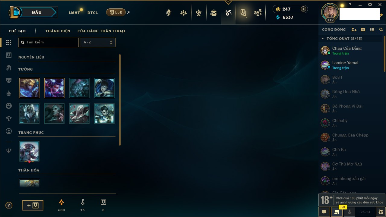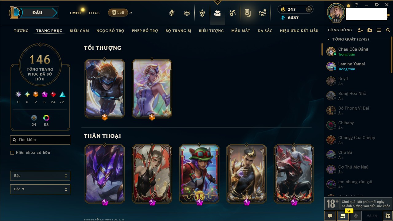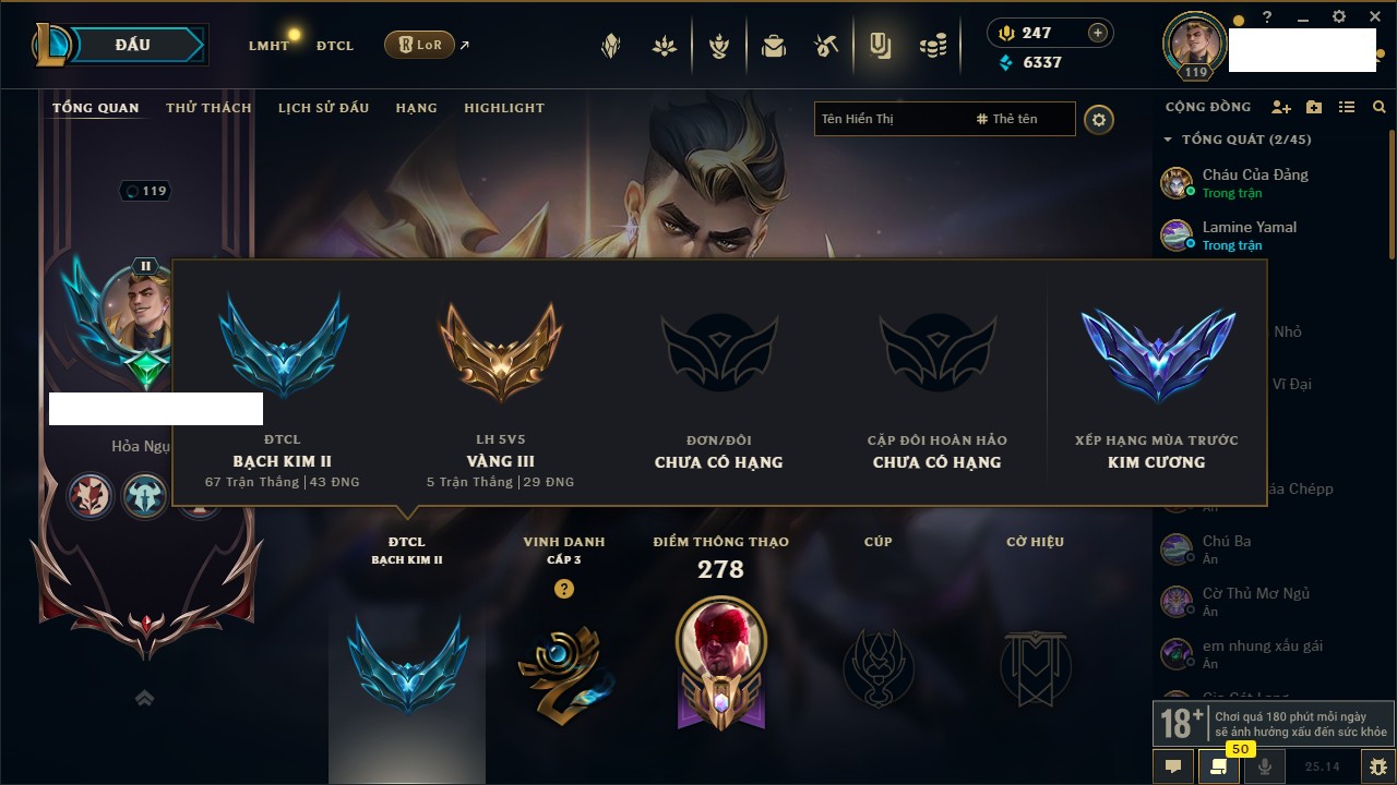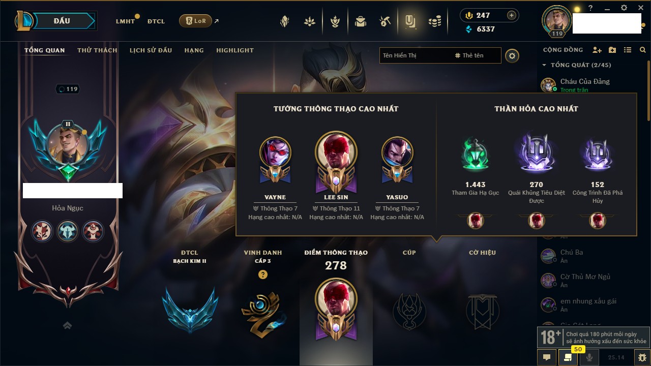 Rank Đơn: Bạch Kim IIKhung: Bạch kimTướng: 171 - Còn 316137 THXTrang Phục: 89Rank ĐTCL: Bạch Kim IIILinh Thú: 94