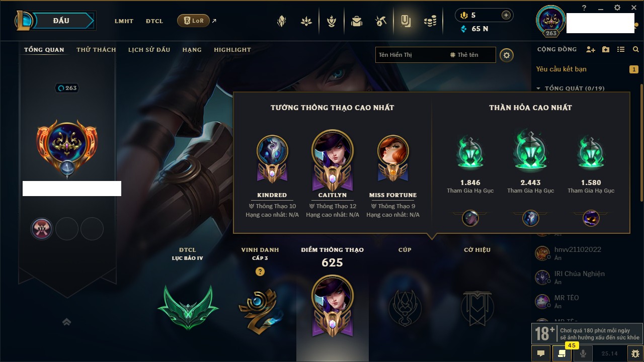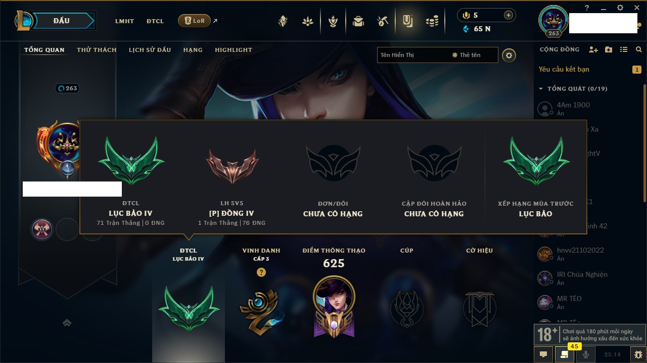 Rank Đơn: Chưa RankKhung: Bạch kimTướng: 172 - Còn 81 THXTrang Phục: 226Rank ĐTCL: Chưa RankLinh Thú: 193