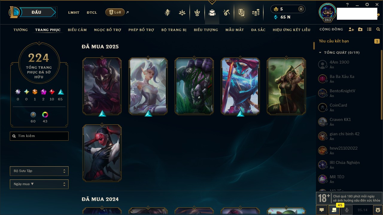 Rank Đơn: Chưa RankKhung: Bạch kimTướng: 170 - Còn 146400 THXTrang Phục: 225Rank ĐTCL: Chưa RankLinh Thú: 134
