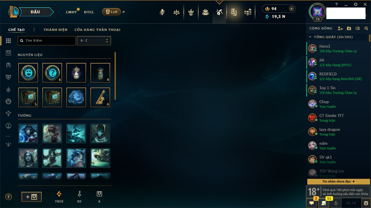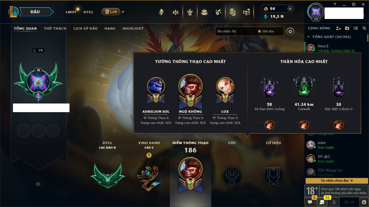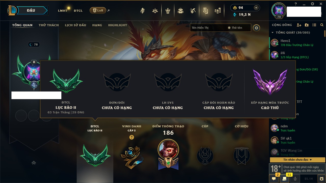 Rank Đơn: Bạch Kim IVKhung: Bạch kimTướng: 171 - Còn 154285 THXTrang Phục: 169Rank ĐTCL: Bạch Kim IILinh Thú: 60