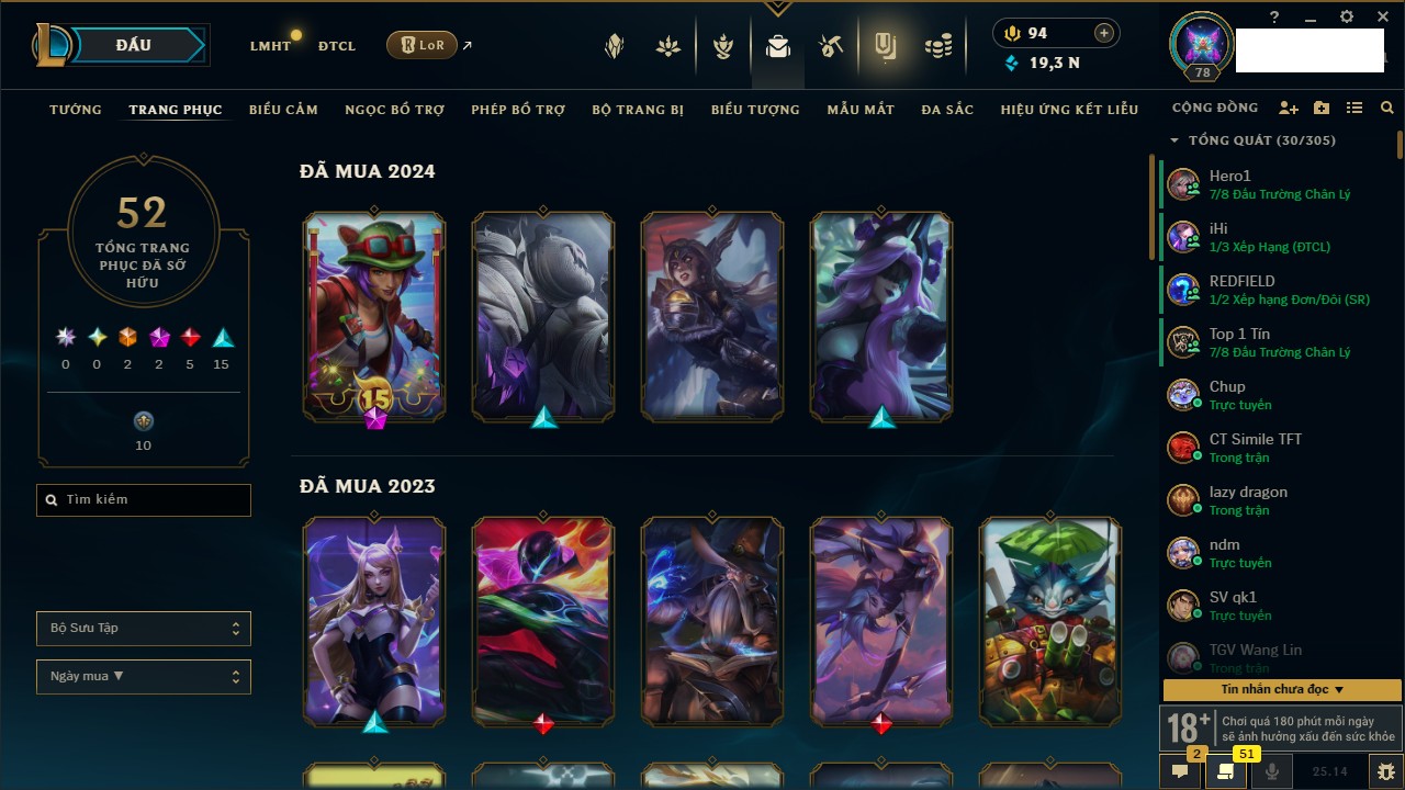 Rank Đơn: Vàng IVKhung: BạcTướng: 166 - Còn 180925 THXTrang Phục: 163Rank ĐTCL: Chưa RankLinh Thú: 67