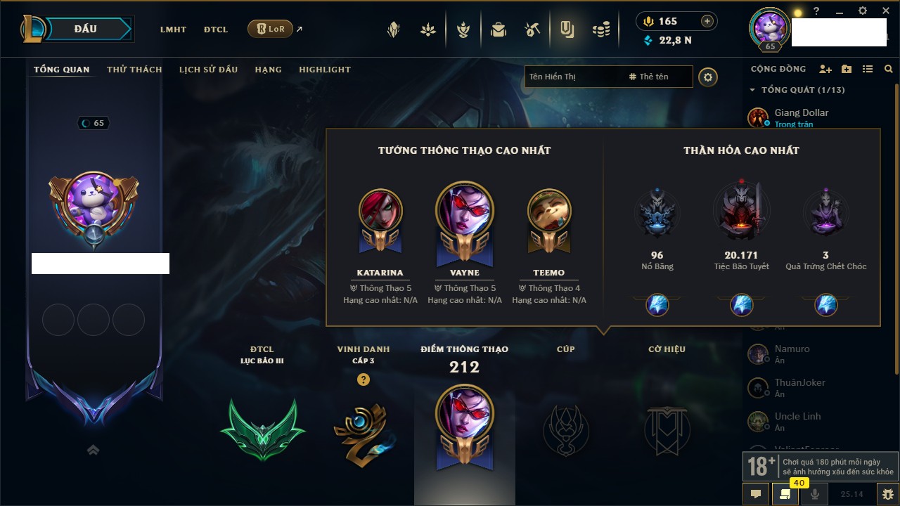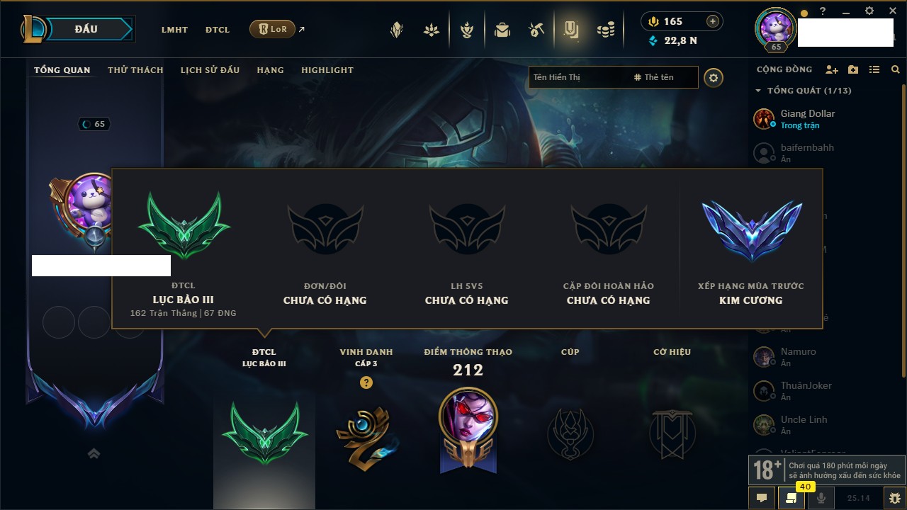 Rank Đơn: Sắt IIIKhung: SắtTướng: 171 - Còn 62070 THXTrang Phục: 198Rank ĐTCL: Bạch Kim IIILinh Thú: 237