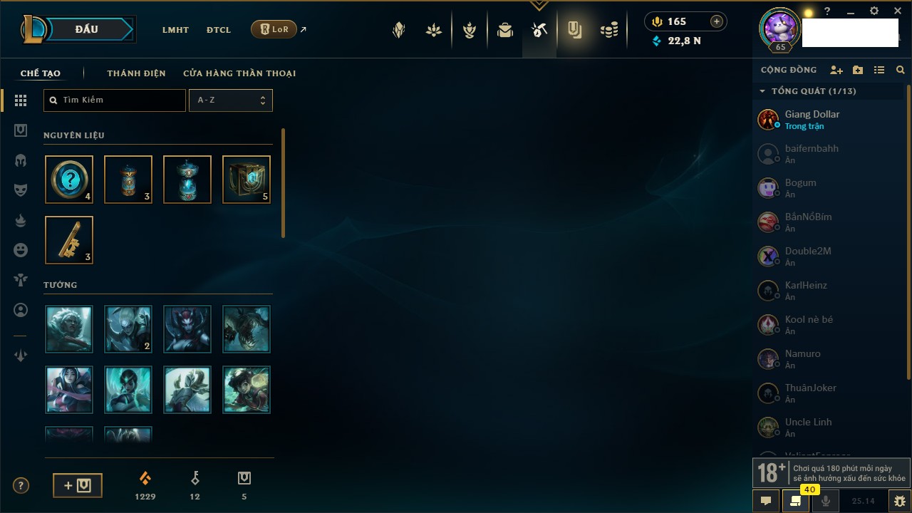 Rank Đơn: Bạch Kim IVKhung: VàngTướng: 171 - Còn 130578 THXTrang Phục: 253Rank ĐTCL: Chưa RankLinh Thú: 20
