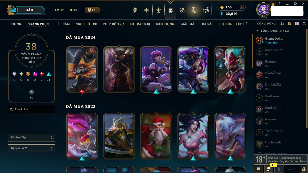Rank Đơn: Vàng IIKhung: VàngTướng: 171 - Còn 219803 THXTrang Phục: 254Rank ĐTCL: Chưa RankLinh Thú: 78