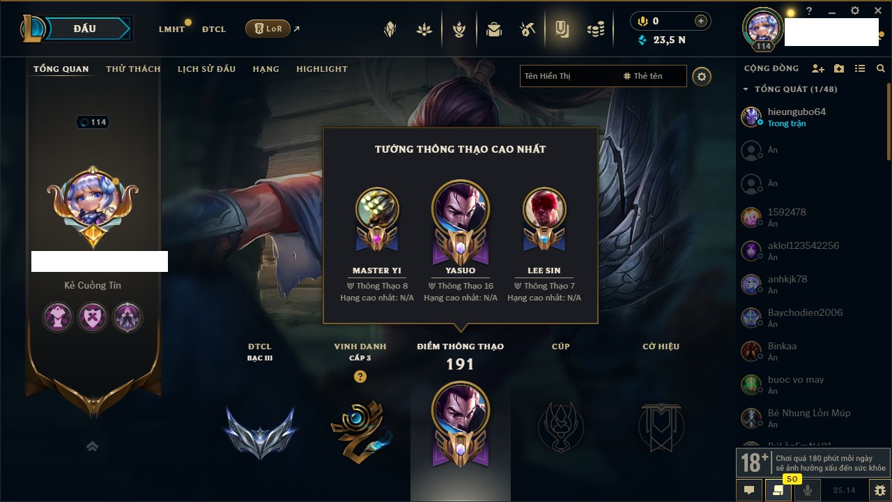Rank Đơn: Bạch Kim IVKhung: Bạch kimTướng: 171 - Còn 54021 THXTrang Phục: 327Rank ĐTCL: Chưa RankLinh Thú: 115
