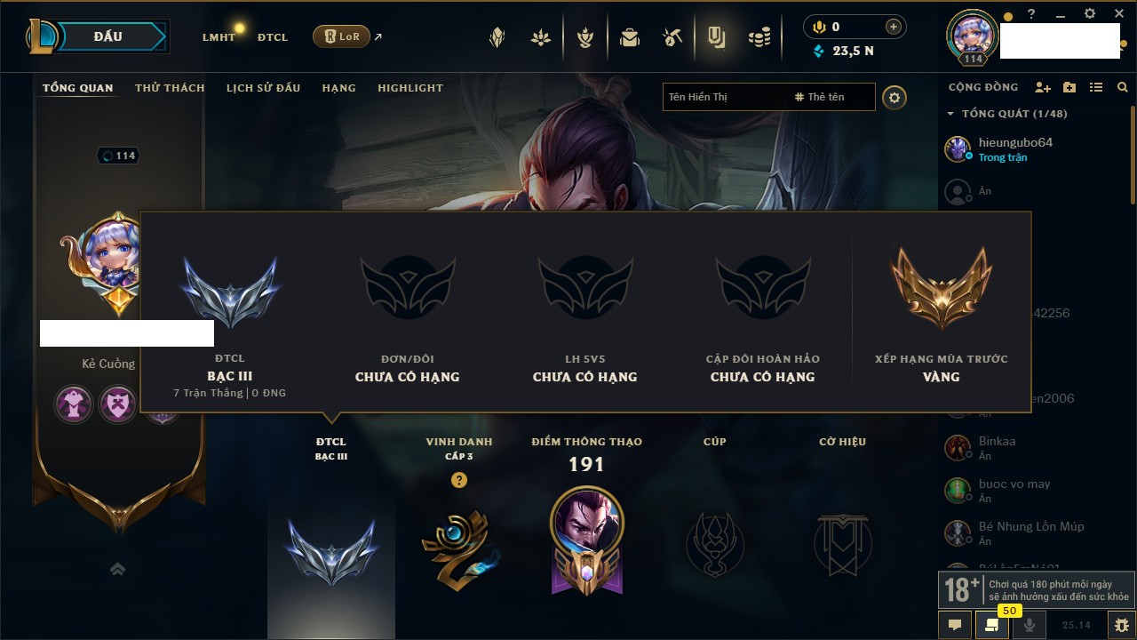 Rank Đơn: Vàng IKhung: BạcTướng: 171 - Còn 60584 THXTrang Phục: 286Rank ĐTCL: Vàng IIILinh Thú: 117
