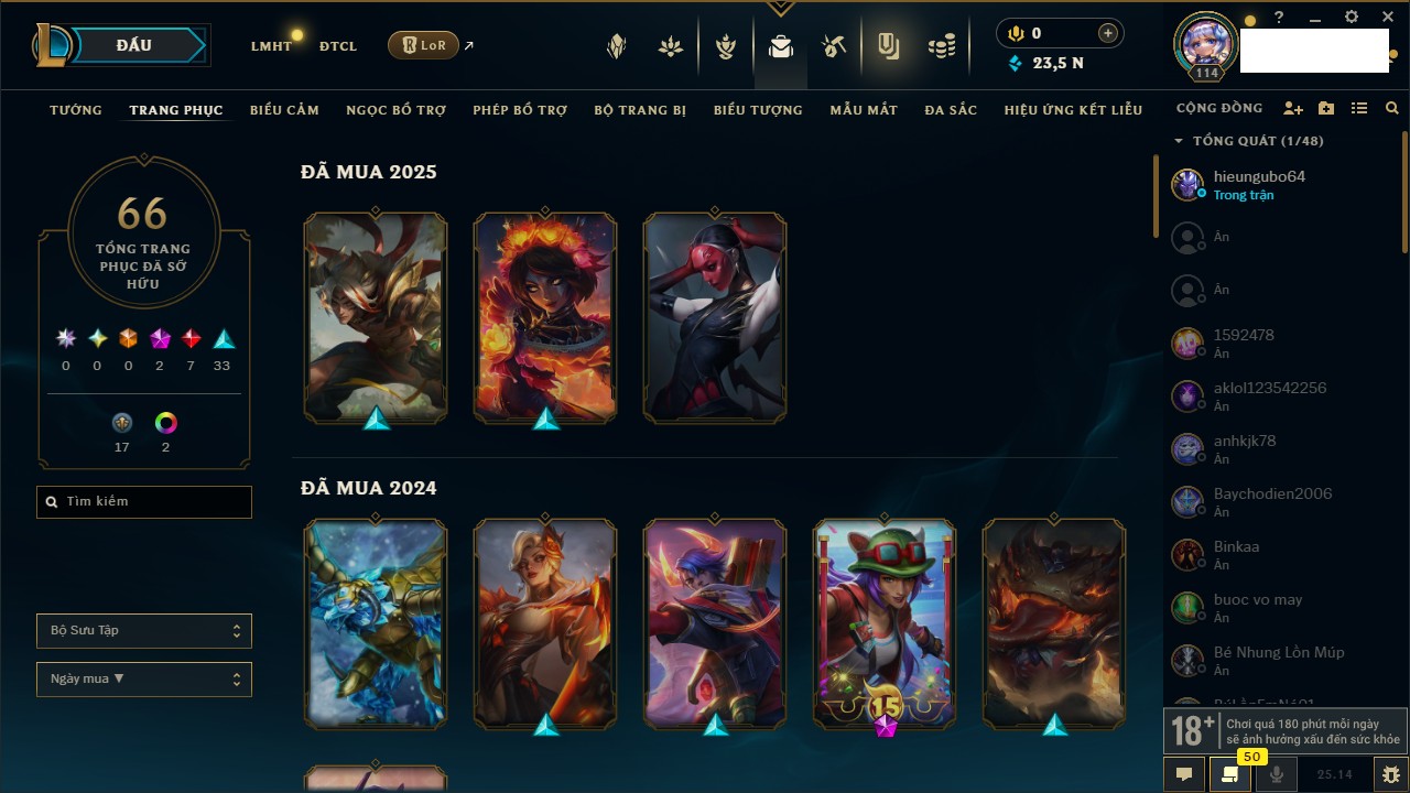 Rank Đơn: Vàng IIIKhung: VàngTướng: 171 - Còn 88128 THXTrang Phục: 329Rank ĐTCL: Chưa RankLinh Thú: 41