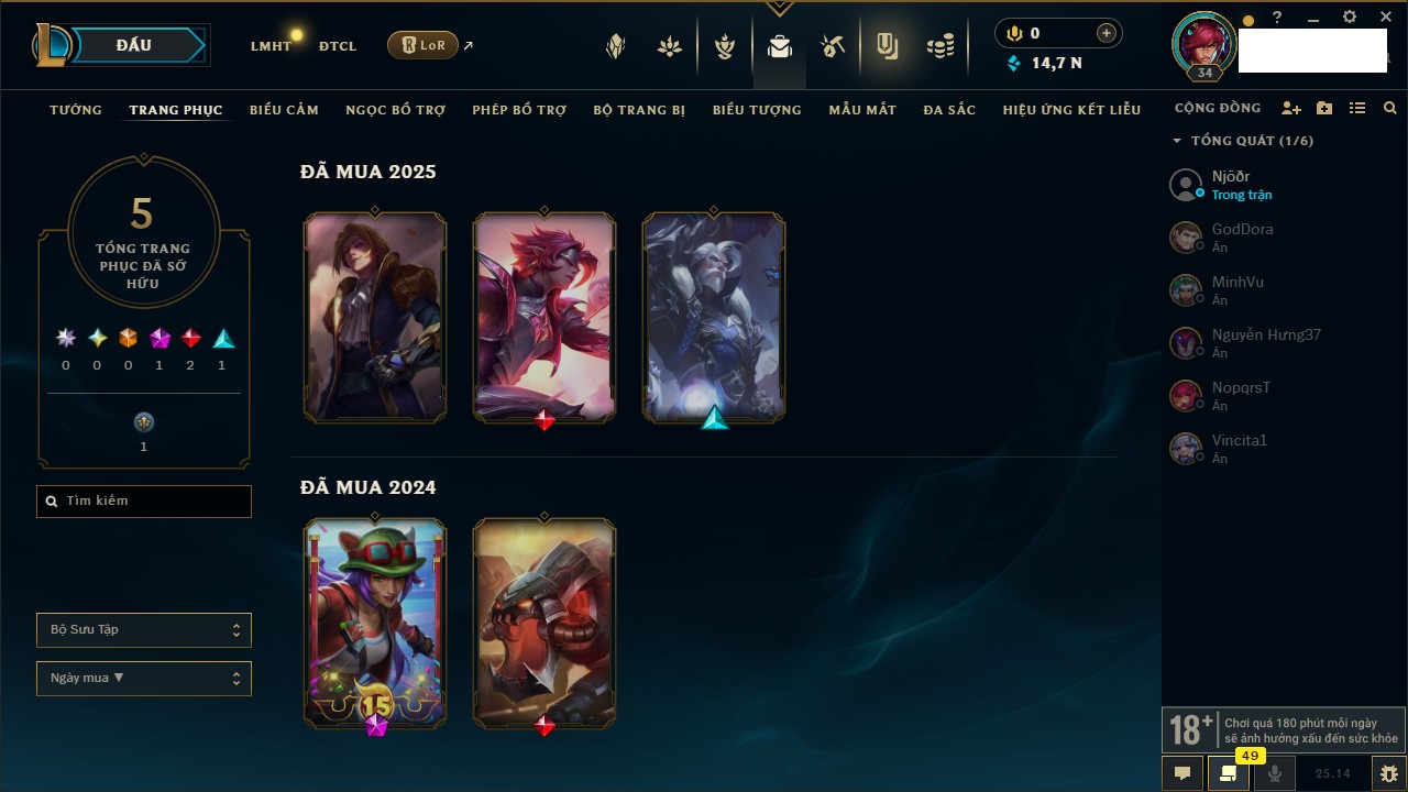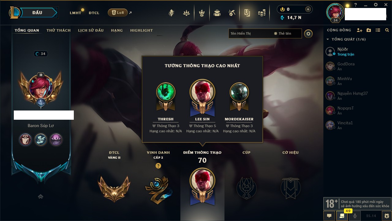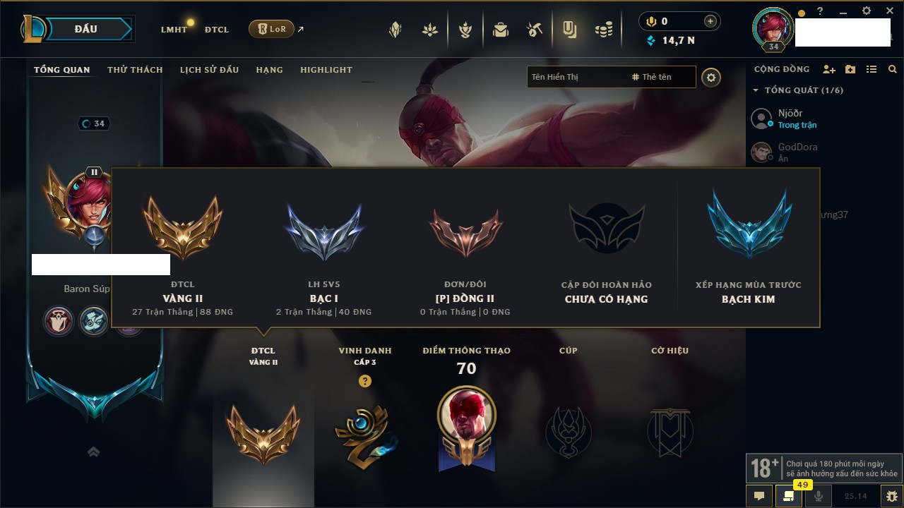 Rank Đơn: Sắt IIIKhung: Chưa có khungTướng: 63 - Còn 185 THXTrang Phục: 8Rank ĐTCL: Chưa RankLinh Thú: 75