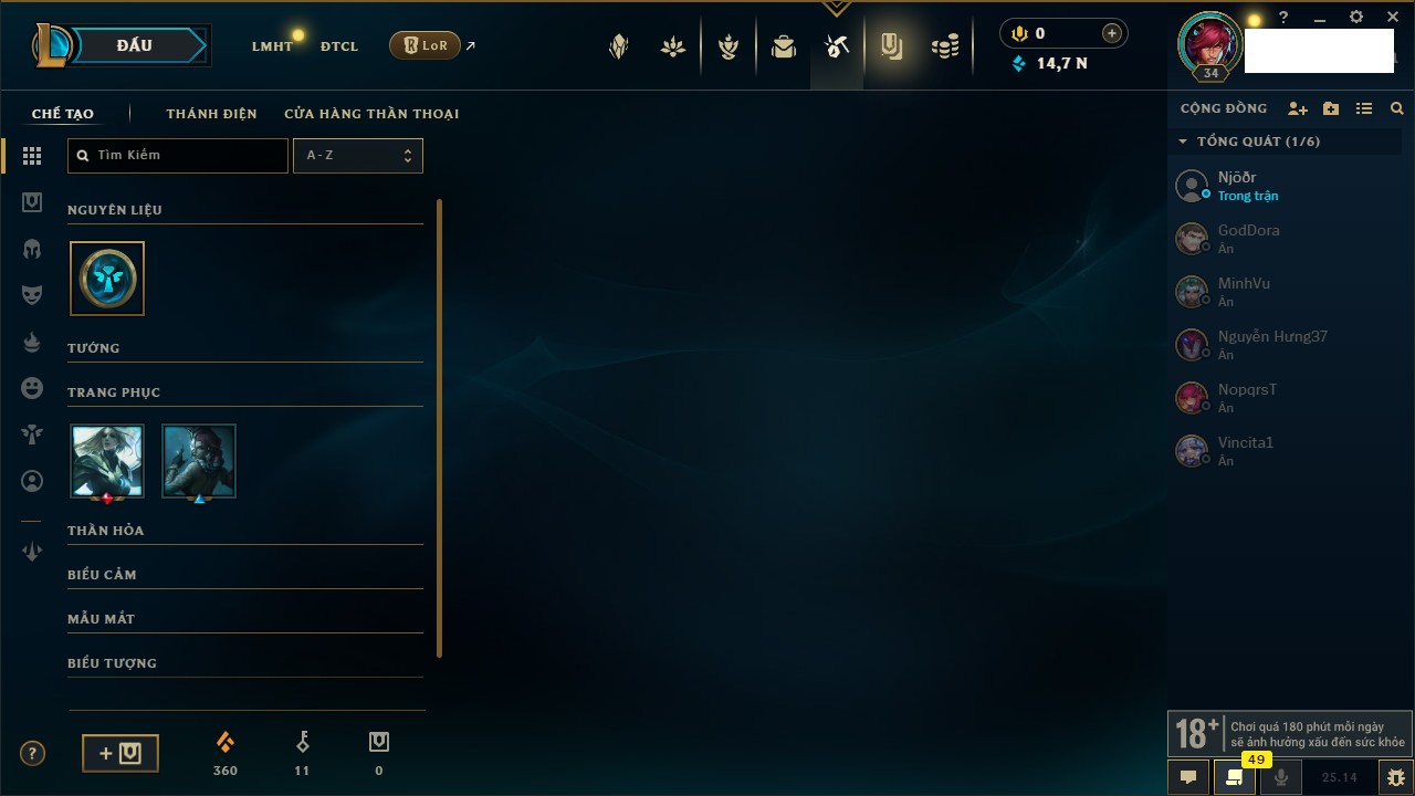 Rank Đơn: Chưa rank mùa nàoKhung: Chưa có khungTướng: 159 - Còn 15030 THXTrang Phục: 5Rank ĐTCL: Chưa RankLinh Thú: 51