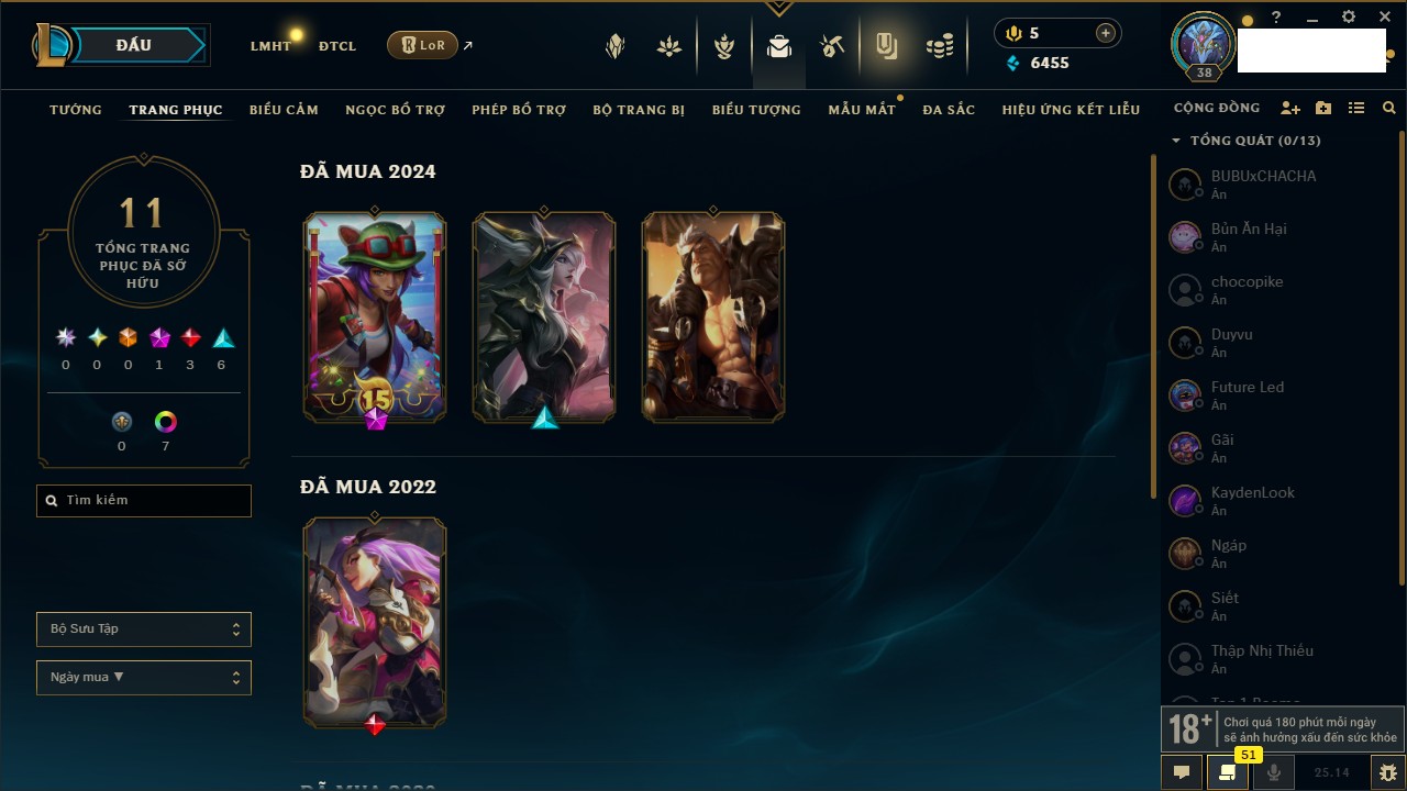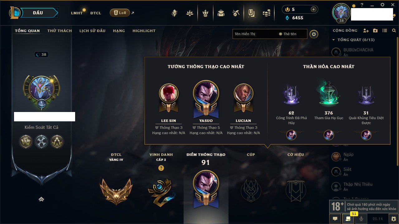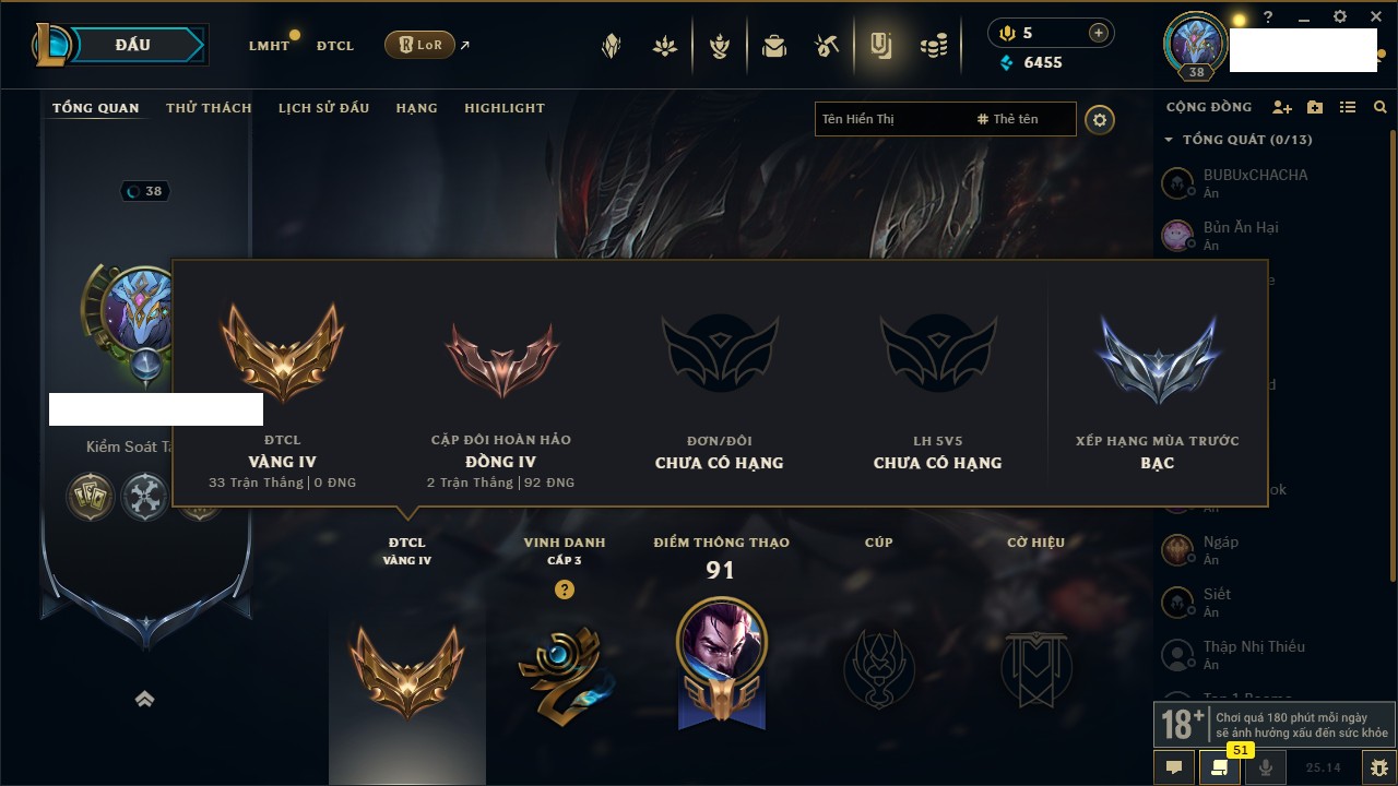 Rank Đơn: Chưa RankKhung: Chưa có khungTướng: 165 - Còn 3214 THXTrang Phục: 160Rank ĐTCL: Chưa RankLinh Thú: 28