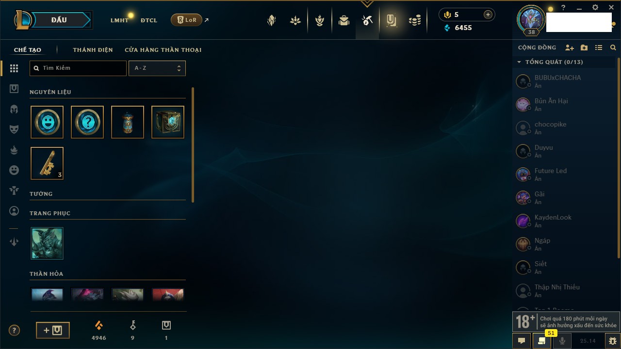Rank Đơn: Chưa RankKhung: Chưa có khungTướng: 37 - Còn 27387 THXTrang Phục: 10Rank ĐTCL: Chưa RankLinh Thú: 1