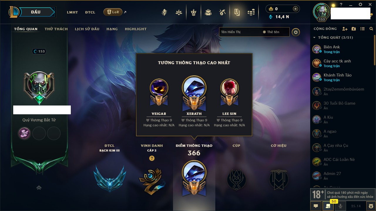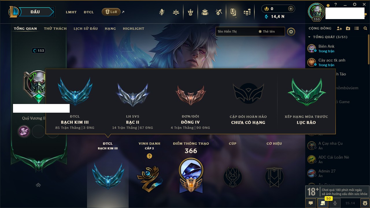 Rank Đơn: Bạc IIIKhung: Chưa có khungTướng: 171 - Còn 21493 THXTrang Phục: 252Rank ĐTCL: Bạch Kim IVLinh Thú: 123