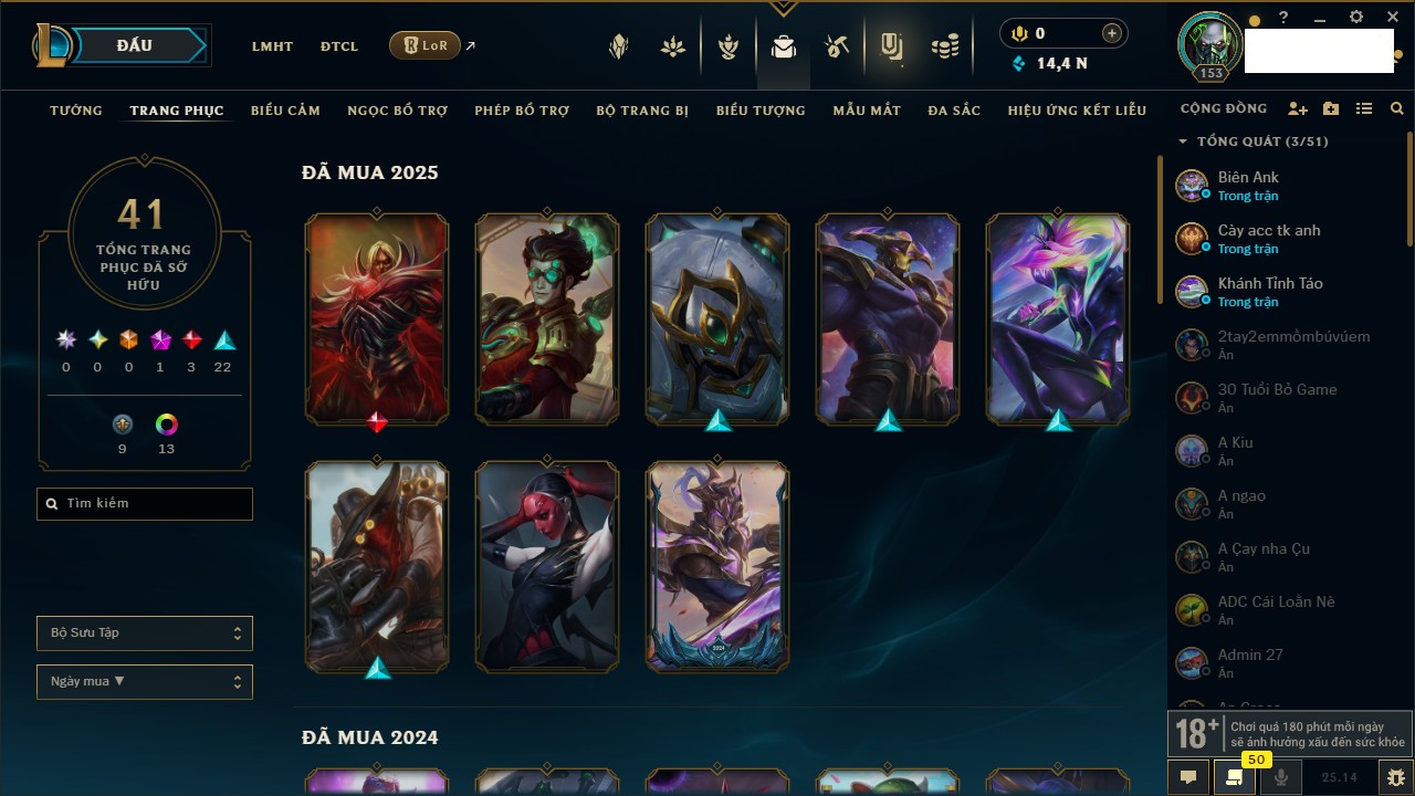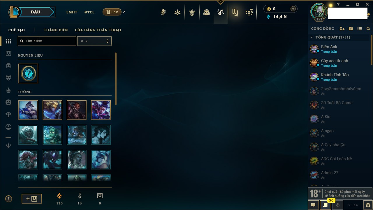 Rank Đơn: Vàng IIKhung: VàngTướng: 171 - Còn 34018 THXTrang Phục: 250Rank ĐTCL: Sắt IILinh Thú: 19