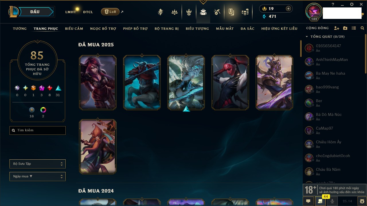 Rank Đơn: Vàng IIIKhung: VàngTướng: 171 - Còn 88128 THXTrang Phục: 329Rank ĐTCL: Chưa RankLinh Thú: 41
