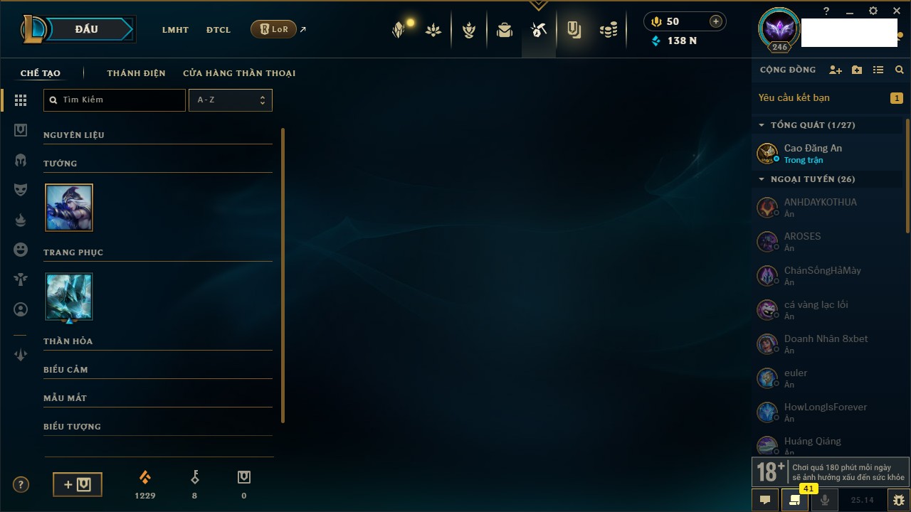 Rank Đơn: Vàng IIKhung: Bạch kimTướng: 172 - Còn 123420 THXTrang Phục: 231Rank ĐTCL: Bạch Kim IVLinh Thú: 213