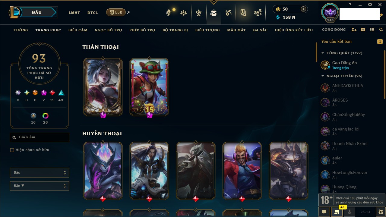 Rank Đơn: Vàng IIIKhung: VàngTướng: 172 - Còn 200315 THXTrang Phục: 87Rank ĐTCL: Chưa RankLinh Thú: 136