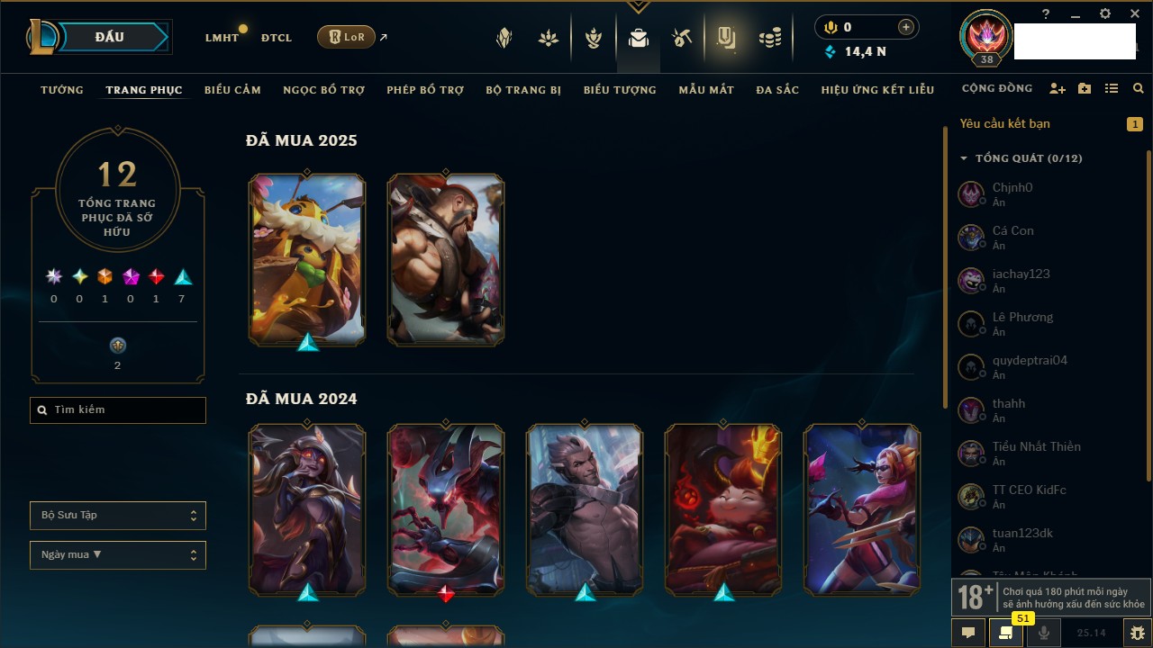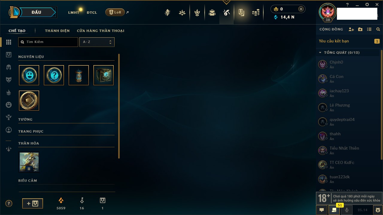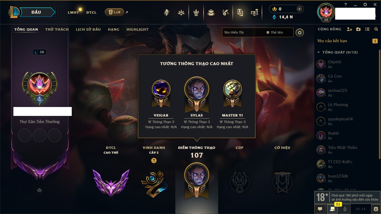 Rank Đơn: Sắt IV Khung: Chưa có khung Tướng: 163 - Còn 14483 THX Trang Phục: 12 Rank ĐTCL: Chưa Rank Linh Thú: 147