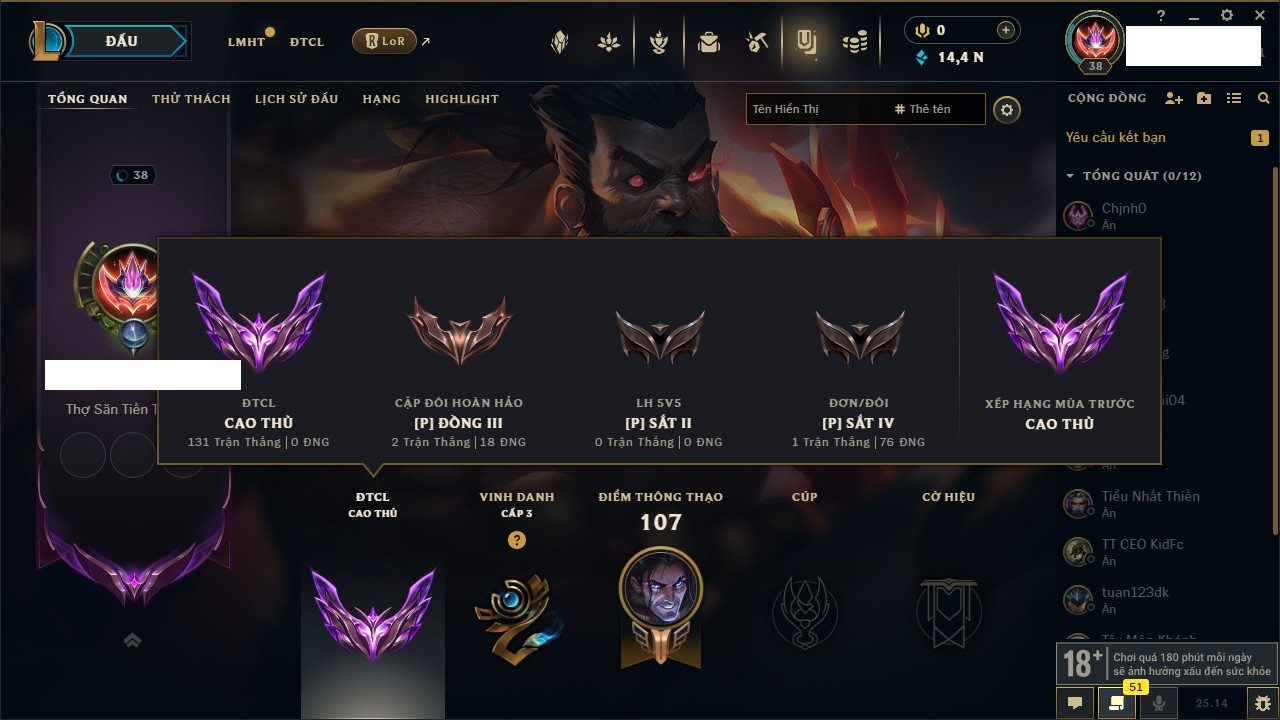 Rank Đơn: Sắt III Khung: Chưa có khung Tướng: 56 - Còn 69 THX Trang Phục: 7 Rank ĐTCL: Bạc I Linh Thú: 107