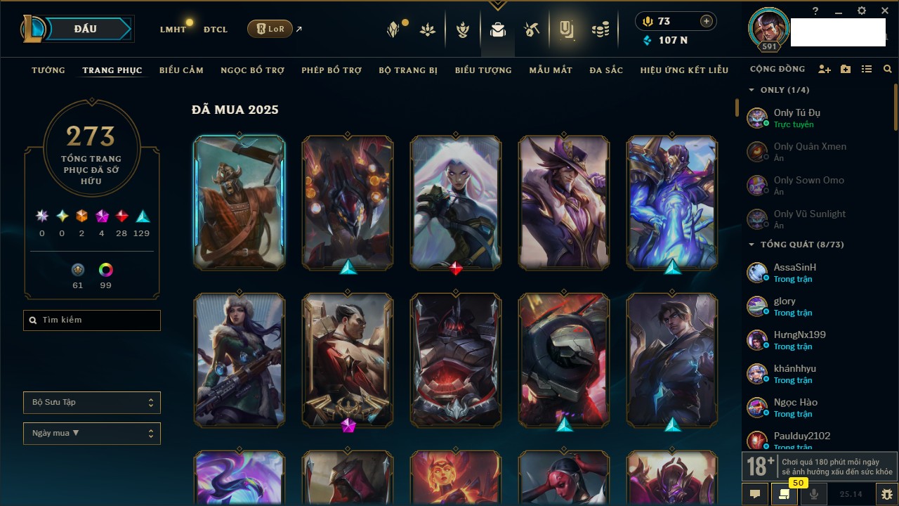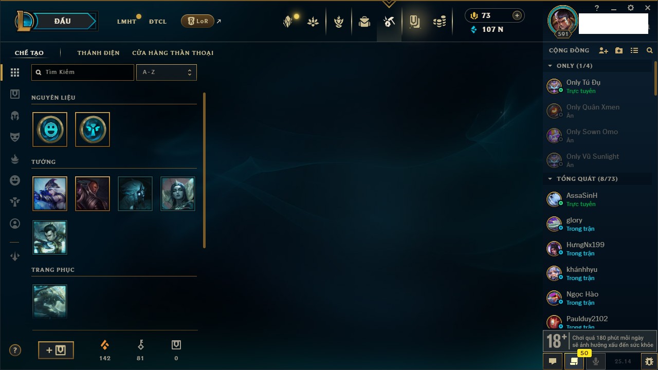 Rank Đơn: Chưa RankKhung: Chưa có khungTướng: 169 - Còn 43188 THXTrang Phục: 205Rank ĐTCL: Chưa RankLinh Thú: 259