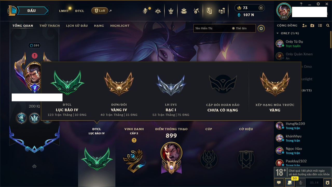 Rank Đơn: Chưa RankKhung: Chưa có khungTướng: 165 - Còn 79975 THXTrang Phục: 210Rank ĐTCL: Lục Bảo IIILinh Thú: 149