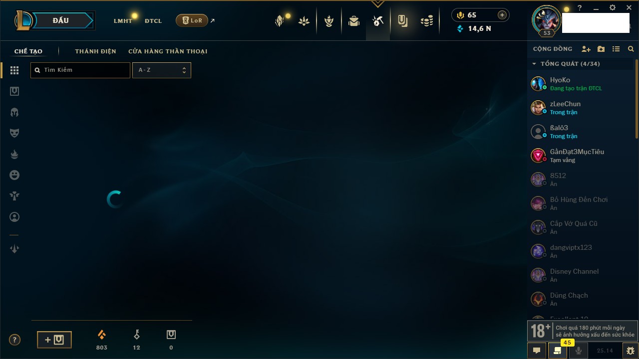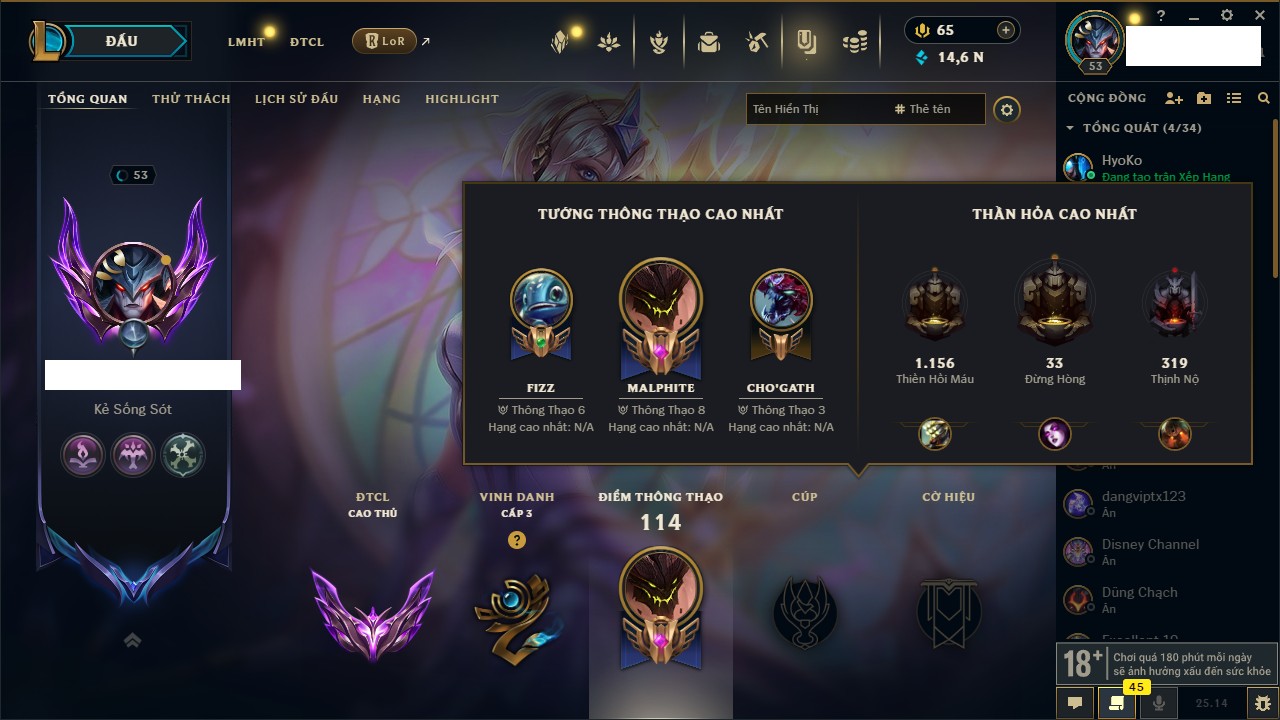 Rank Đơn: Sắt IKhung: SắtTướng: 171 - Còn 125789 THXTrang Phục: 151Rank ĐTCL: Đồng IIILinh Thú: 72