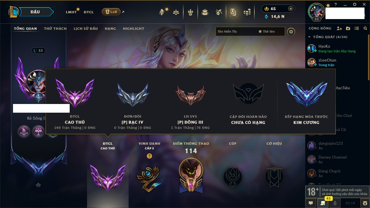 Rank Đơn: Đồng IIIKhung: ĐồngTướng: 169 - Còn 54414 THXTrang Phục: 95Rank ĐTCL: Bạch Kim IVLinh Thú: 112