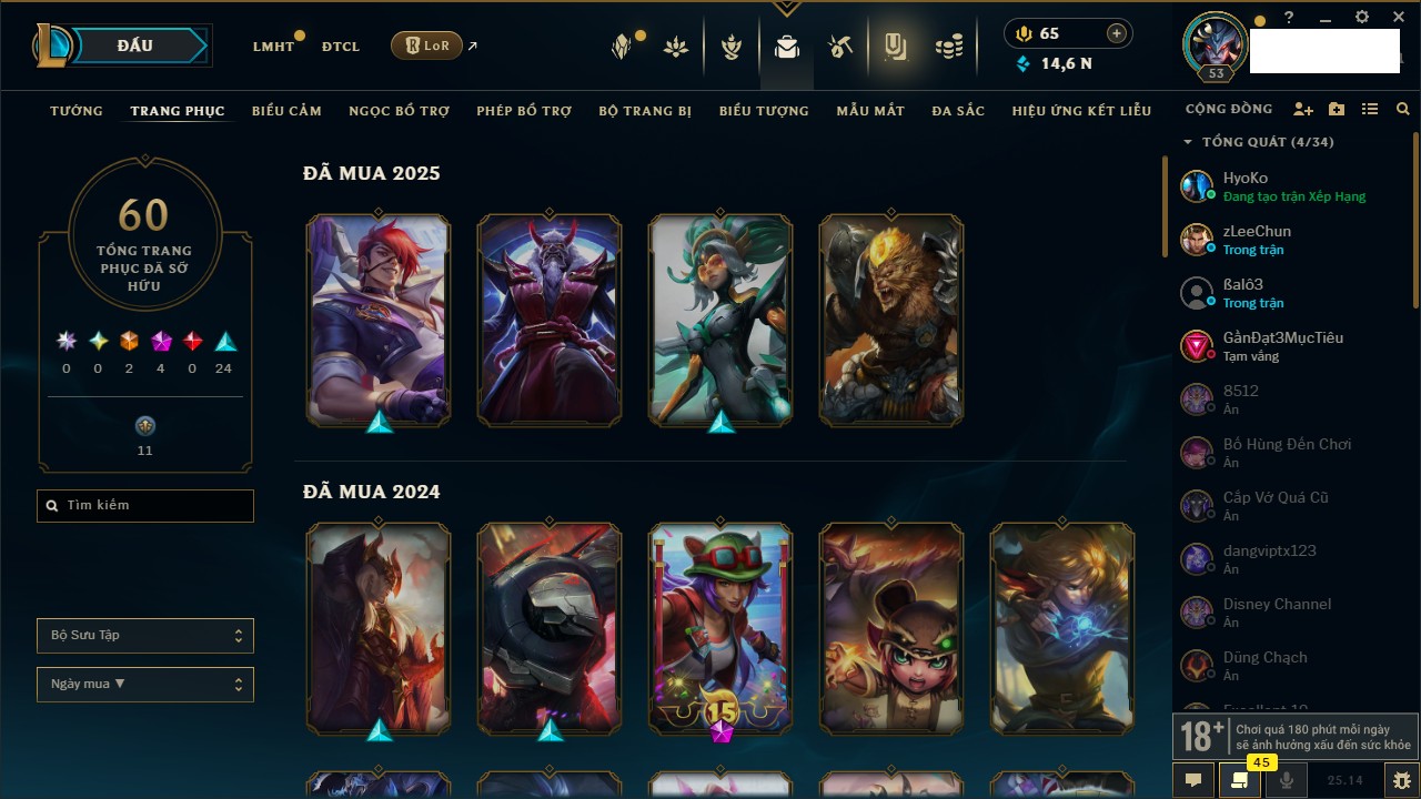 Rank Đơn: Vàng IVKhung: BạcTướng: 166 - Còn 180925 THXTrang Phục: 163Rank ĐTCL: Chưa RankLinh Thú: 67