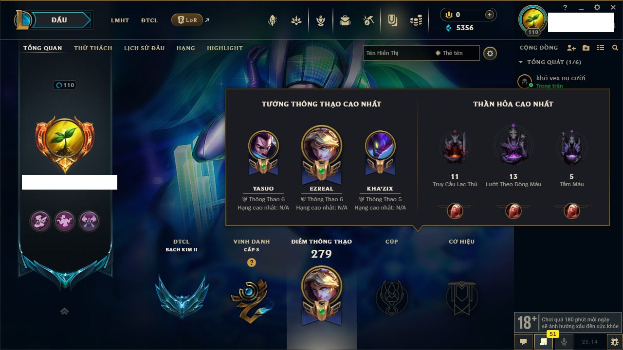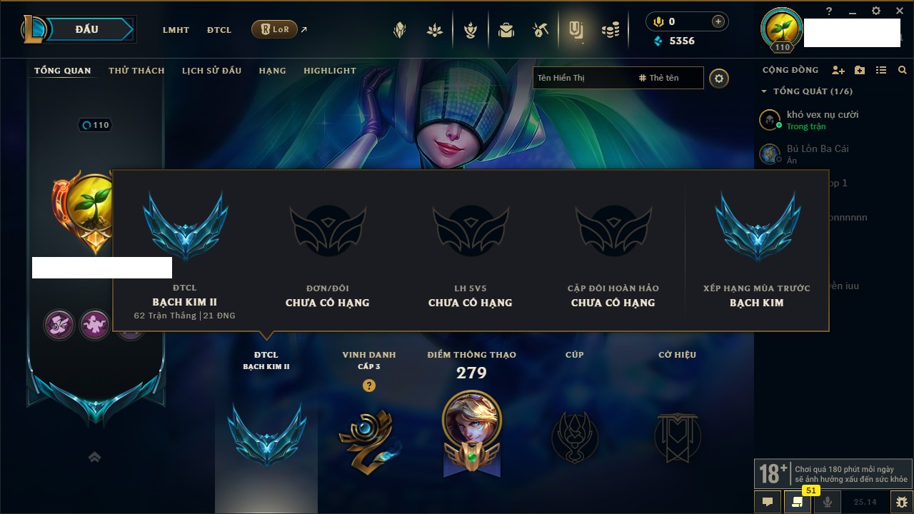 Rank Đơn: Bạc IIIKhung: Chưa có khungTướng: 171 - Còn 21493 THXTrang Phục: 252Rank ĐTCL: Bạch Kim IVLinh Thú: 123