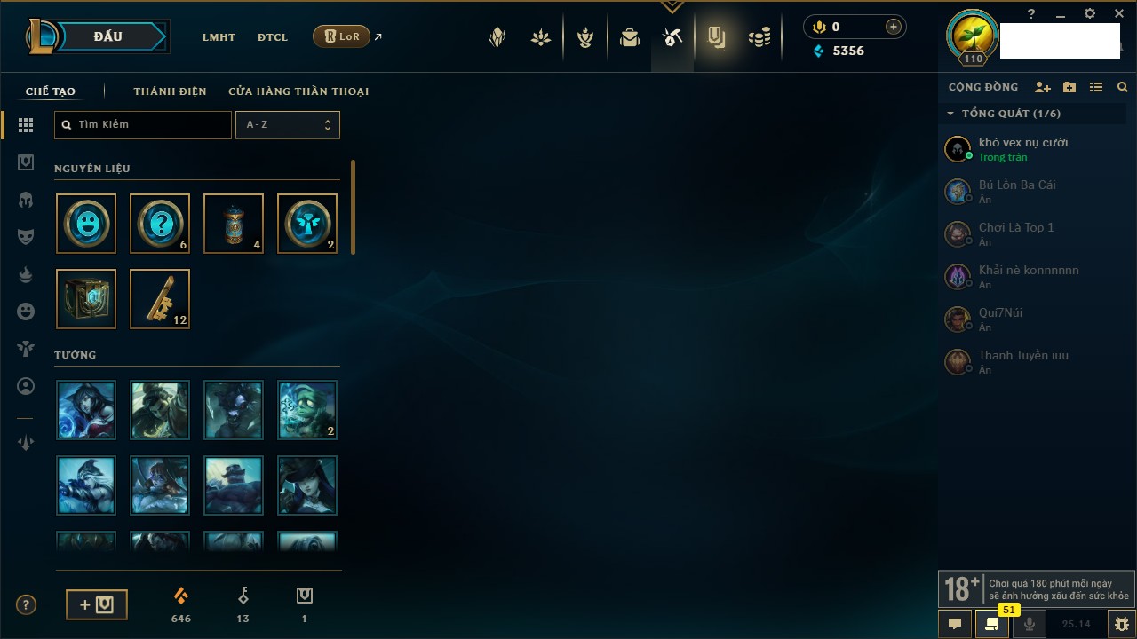 Rank Đơn: Vàng IIKhung: VàngTướng: 171 - Còn 34018 THXTrang Phục: 250Rank ĐTCL: Sắt IILinh Thú: 19