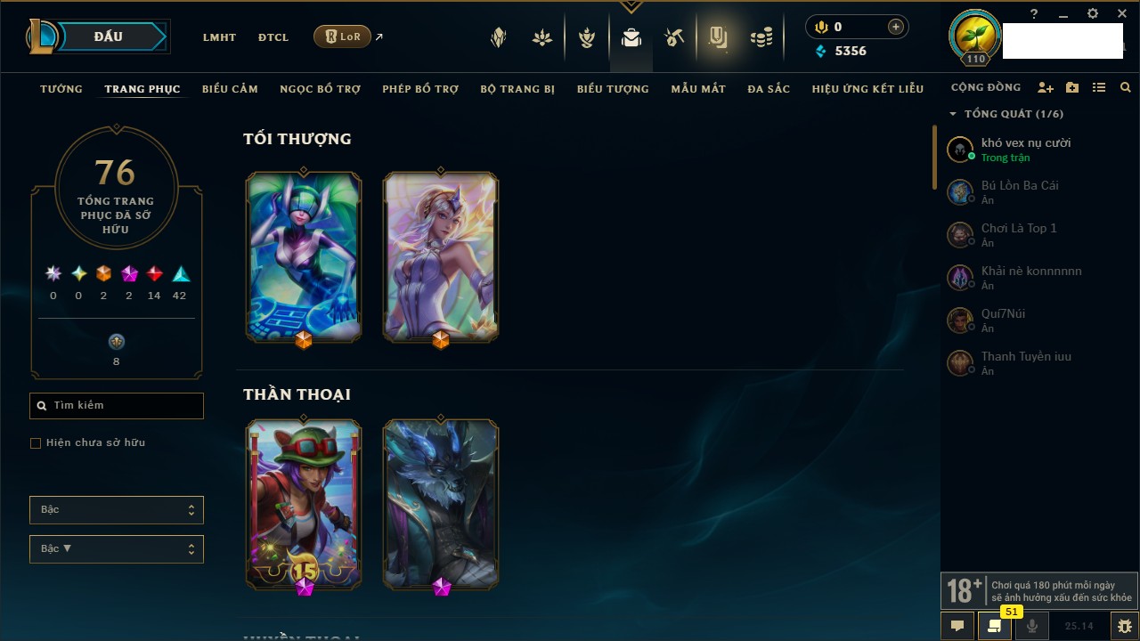 Rank Đơn: Vàng IIIKhung: VàngTướng: 171 - Còn 159339 THXTrang Phục: 218Rank ĐTCL: Lục Bảo IIILinh Thú: 151