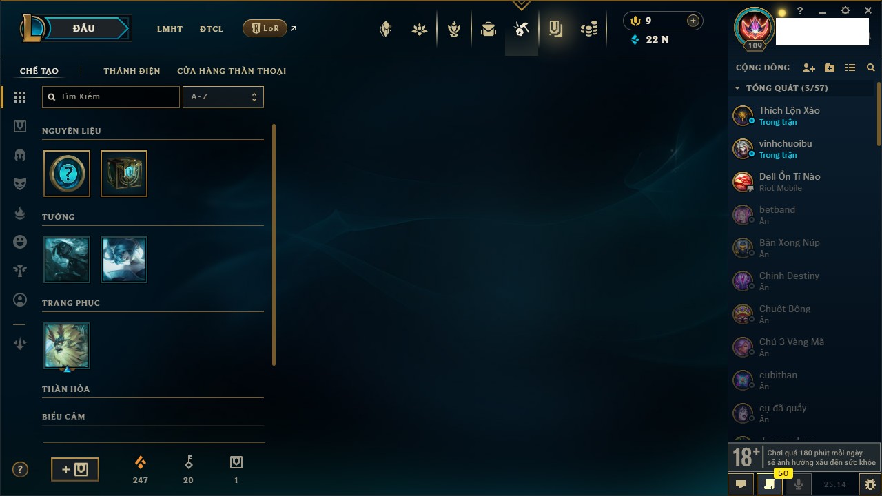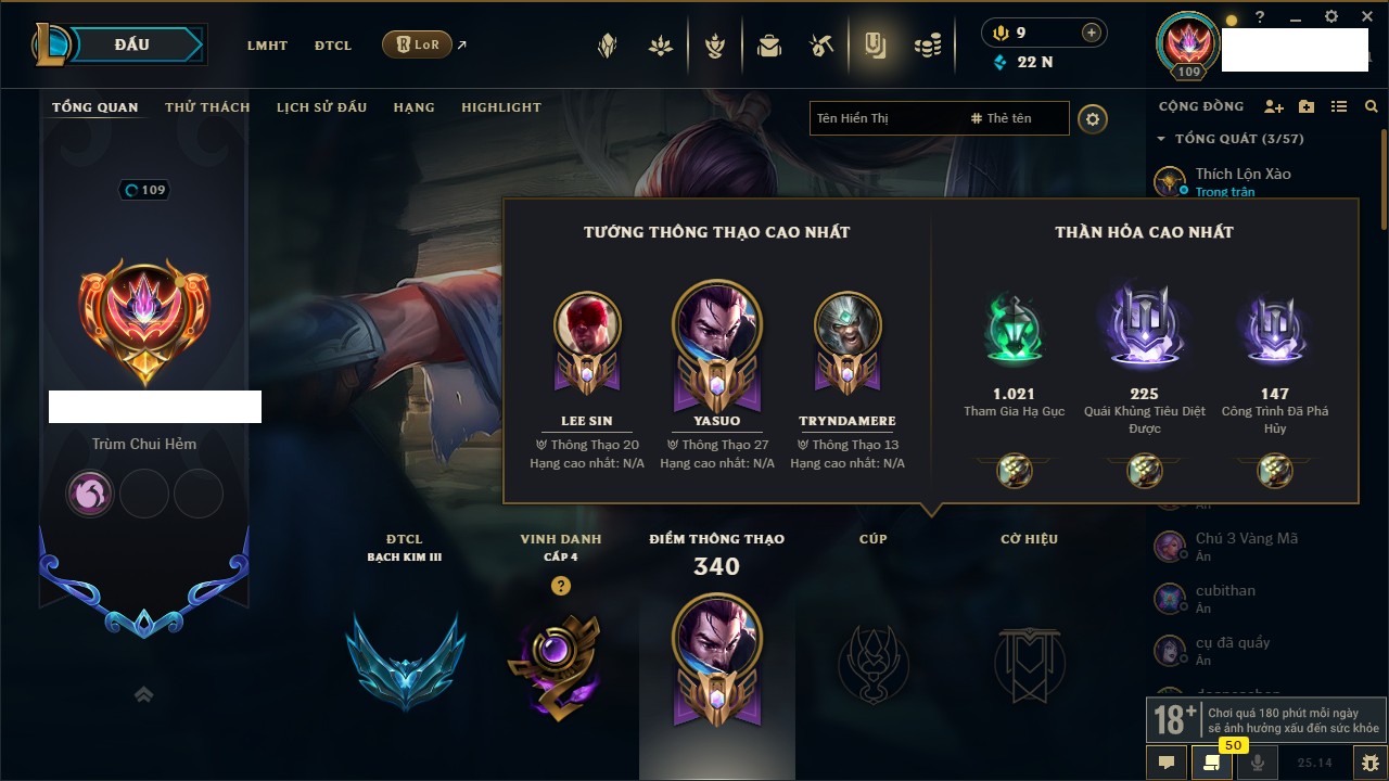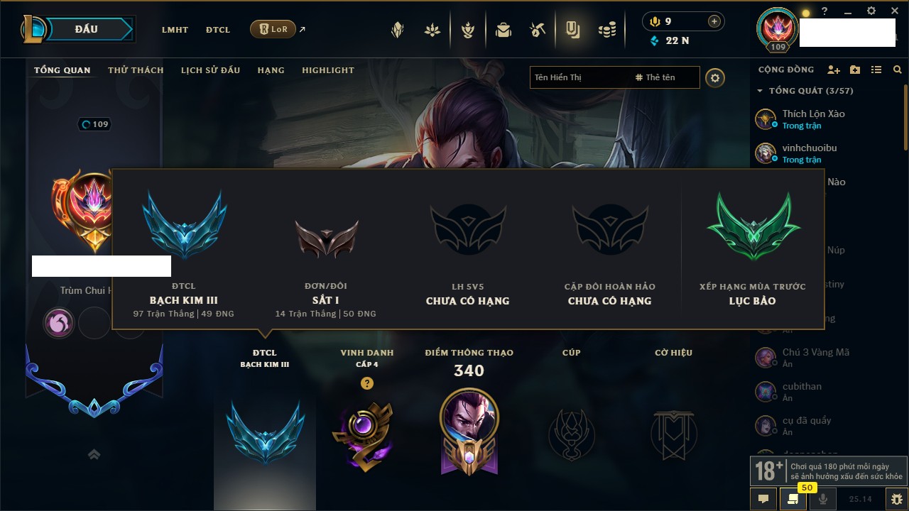 Rank Đơn: Vàng IKhung: BạcTướng: 171 - Còn 60584 THXTrang Phục: 286Rank ĐTCL: Vàng IIILinh Thú: 117
