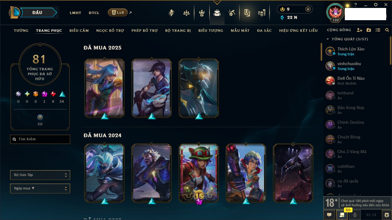Rank Đơn: Vàng IIIKhung: VàngTướng: 171 - Còn 88128 THXTrang Phục: 329Rank ĐTCL: Chưa RankLinh Thú: 41