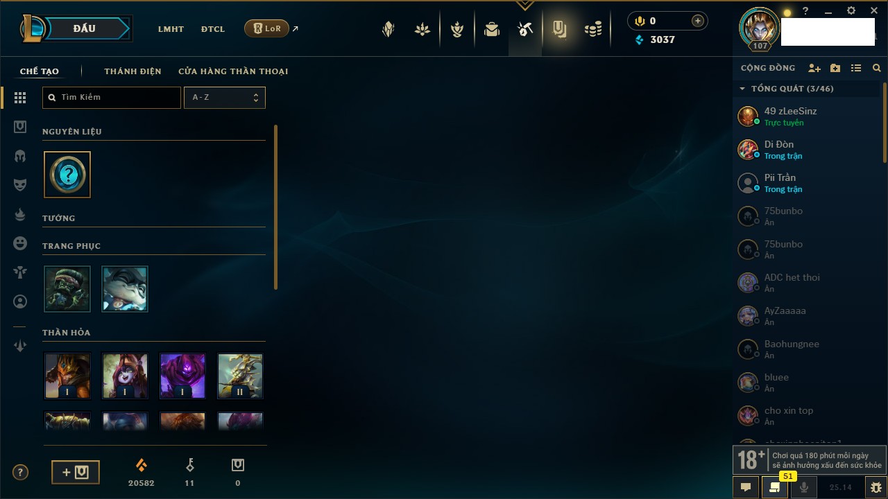 Rank Đơn: Bạch Kim IVKhung: VàngTướng: 171 - Còn 130578 THXTrang Phục: 253Rank ĐTCL: Chưa RankLinh Thú: 20