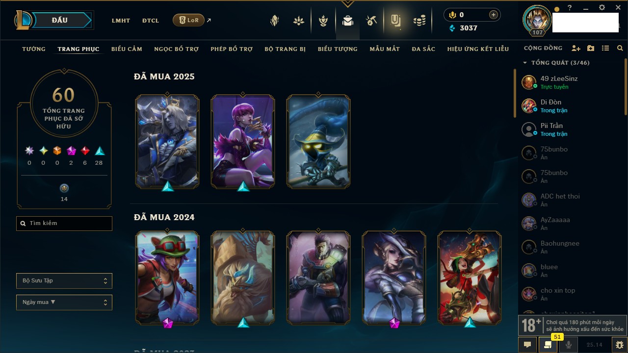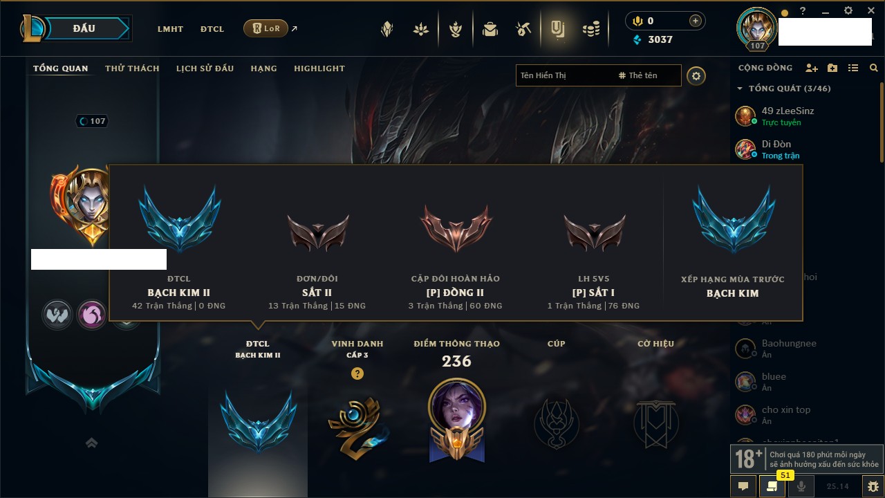 Rank Đơn: Vàng IIIKhung: Bạch kimTướng: 171 - Còn 98230 THXTrang Phục: 235Rank ĐTCL: Vàng IVLinh Thú: 59