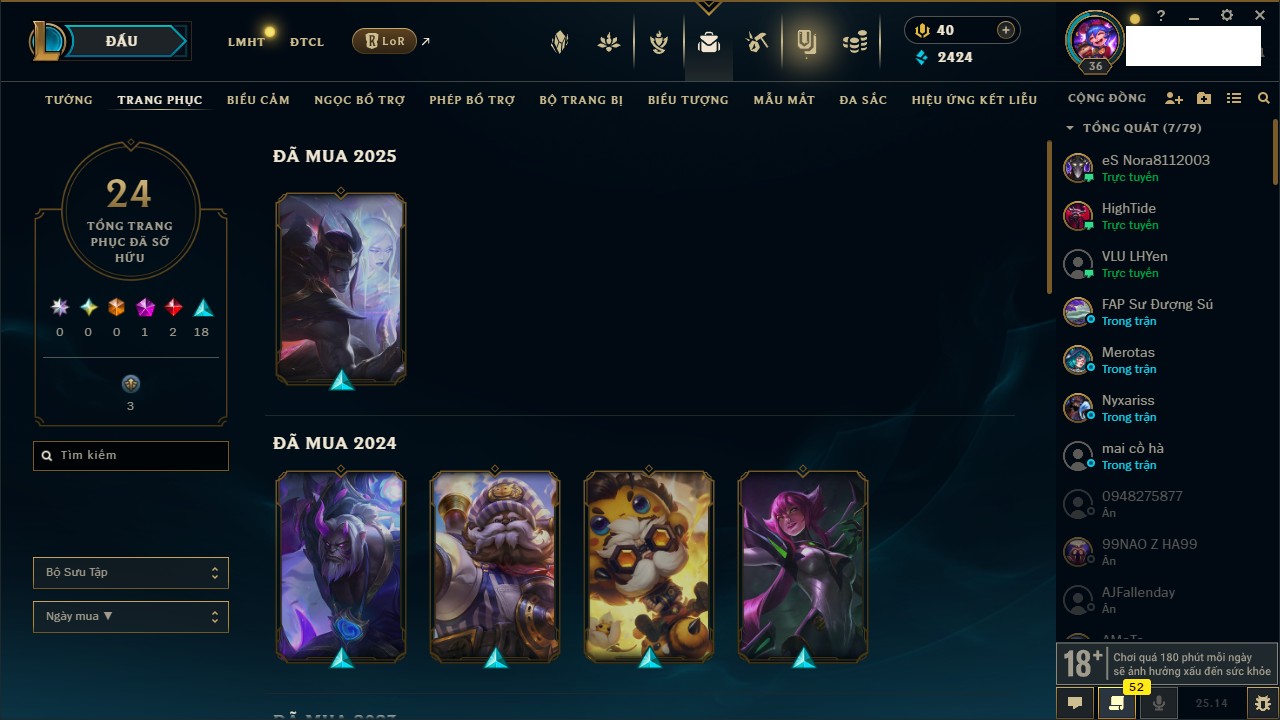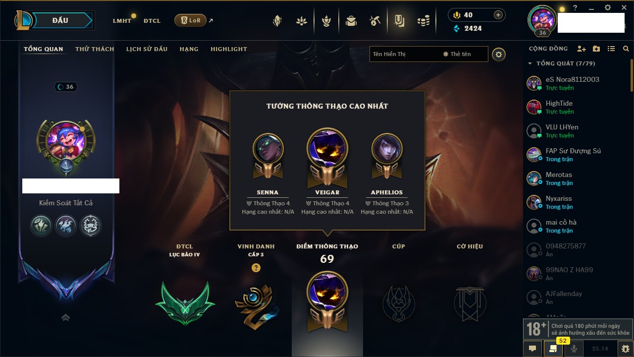 Rank Đơn: Bạc IIIKhung: BạcTướng: 140 - Còn 1624 THXTrang Phục: 36Rank ĐTCL: Chưa RankLinh Thú: 118
